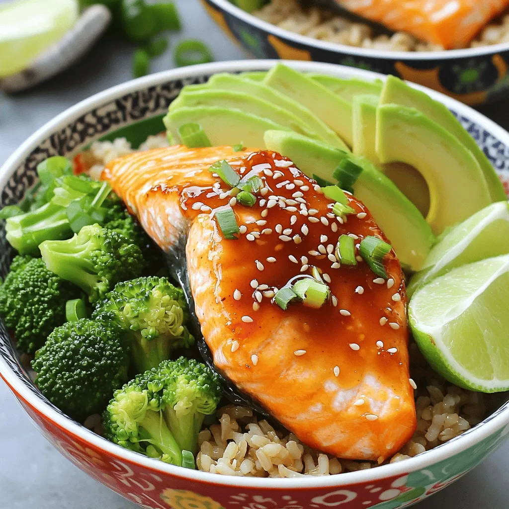While the salmon cooks, prepare your bowls. Start by dividing the cooked brown rice or quinoa among them. On one side of each bowl, add a portion of steamed broccoli florets. Next, arrange the sliced avocado next to the broccoli. Once the salmon is ready, place a fillet on top of the rice or quinoa in each bowl. If you have leftover marinade, drizzle it over the salmon. Finally, garnish with chopped green onions and sesame seeds. Serve with lime wedges for a fresh kick.