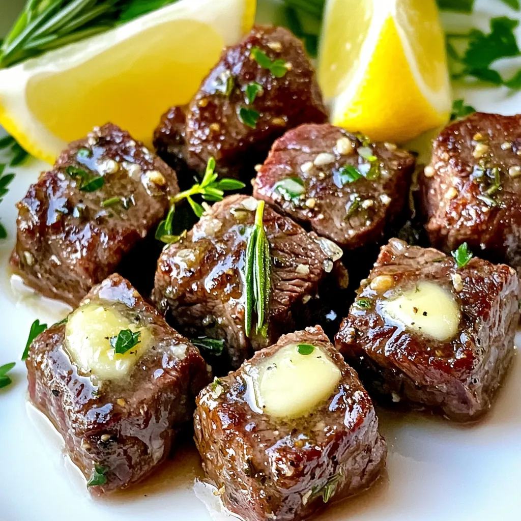 For this tasty dish, you need a few key items: - 1 lb sirloin steak, cut into bite-sized cubes - 4 tablespoons unsalted butter, melted - 4 cloves garlic, minced - 1 teaspoon fresh rosemary, chopped - 1 teaspoon fresh thyme, chopped - Salt and pepper to taste - 1 tablespoon olive oil - 1 tablespoon fresh parsley, chopped (for garnish) - Lemon wedges (for serving) These ingredients create a rich and savory flavor. Sirloin steak works well because it is tender and juicy. The garlic and herbs add a lovely taste. The seasonings make this dish stand out. Here’s what I use: - Salt and pepper enhance the natural flavors of the steak. - Fresh rosemary and thyme add an earthy aroma. - The parsley garnish gives a pop of color and freshness. - Lemon wedges bring a zesty contrast to the richness. Combining these flavors elevates the dish. The garlic butter marinade coats the steak perfectly, making each bite delicious. To make Baked Garlic Butter Steak Bites, you will need: - A large mixing bowl for the marinade - A sharp knife and cutting board to cube the steak - A baking sheet lined with parchment paper - An oven set to 400°F (200°C) Having the right tools makes cooking easier and more fun. The parchment paper helps with cleanup and keeps the steak from sticking. First, set your oven to 400°F (200°C). This heat is perfect for cooking steak bites. While the oven warms, grab a baking sheet. Line it with parchment paper. This helps with easy cleanup. It also stops the steak from sticking. In a large bowl, melt 4 tablespoons of unsalted butter. Add 4 minced garlic cloves. The garlic gives great flavor. Next, sprinkle in 1 teaspoon each of fresh rosemary and thyme. These herbs add a nice touch. Season with salt and pepper to taste. Mix everything well to create a tasty marinade. Now it’s time for the steak. Cut 1 pound of sirloin steak into bite-sized cubes. Toss these cubed steaks into the bowl with the garlic butter mix. Make sure each piece is coated well. Spread the steak bites on the prepared baking sheet in a single layer. Drizzle 1 tablespoon of olive oil over them. This adds moisture and flavor. Bake the steak bites for 10 to 12 minutes. Stir halfway through for even cooking. The outside should be browned, and the inside cooked to your liking. After baking, let the steak bites rest for 2 to 3 minutes. Finally, sprinkle fresh parsley on top and serve with lemon wedges. The lemon adds a fresh zing. Enjoy your meal! To make the best baked garlic butter steak bites, start with sirloin steak. Sirloin has great flavor and tenderness. Look for a piece that is bright red and has some fat. The fat adds taste and keeps the meat juicy. You can also use ribeye or flank steak if you prefer. Just cut them into bite-sized cubes, and you’ll have a tasty dish. For steak bites, doneness is key. I recommend cooking them to medium-rare for the best flavor. This means an internal temperature of about 130°F (54°C). Use a meat thermometer to check. If you like your steak more cooked, aim for medium (140°F or 60°C). Remember, the steak will keep cooking a bit after you take it out. Let them rest for 2-3 minutes before serving to lock in the juices. These steak bites shine with simple sides. Serve them with a fresh salad or roasted veggies. A side of garlic bread complements their flavor too. For a zesty kick, add lemon wedges. The lemon juice brightens the dish and balances the richness of the steak. You can also sprinkle more fresh herbs on top for added flair. Enjoy your meal! {{image_2}} You can switch up the flavors in baked garlic butter steak bites easily. Try using different herbs. Fresh basil or oregano can add a new twist. If you want more spice, add red pepper flakes or cayenne pepper. You can even mix in some Worcestershire sauce for a savory kick. For a sweet touch, consider a dash of honey or balsamic glaze. These simple swaps will make your dish stand out. Baking is great, but there are other ways to cook steak bites. You can grill them for a smoky flavor. Just marinate your steak bites, then skewer them before grilling. Air frying is also a quick and healthy option. It gives the bites a nice crisp without much oil. If you have a stovetop, sautéing can be fast too. Just heat a pan and cook the steak bites until browned. Each method brings its own unique taste. Think about what to serve with your steak bites. A fresh salad with mixed greens can balance the rich flavors. Roasted veggies or mashed potatoes are great sides as well. For sauces, a creamy garlic sauce or chimichurri adds zest. You can even serve the steak bites with a tangy barbecue sauce for dipping. These pairings will make your meal even more enjoyable. To store leftover steak bites, first let them cool. Place the bites in an airtight container. Make sure to separate layers with parchment paper to keep them from sticking. Store in the fridge for up to three days. This keeps them fresh and tasty for your next meal. When you want to enjoy your steak bites again, use the oven or a skillet. Preheat your oven to 350°F (175°C). Spread the bites on a baking sheet. Heat for about 5-7 minutes until warm. If using a skillet, add a little butter. Heat over medium heat for about 3-4 minutes. This method adds flavor and keeps them juicy. If you want to save steak bites for later, freezing works well. First, let the steak bites cool completely. Then, place them in a freezer bag. Remove air before sealing to prevent freezer burn. Label the bag with the date. You can freeze steak bites for up to three months. When ready to eat, thaw in the fridge overnight. Reheat as mentioned above for a delicious meal. Yes, you can. While sirloin steak works well, other cuts are great too. You might try ribeye, tenderloin, or flank steak. Each cut has its own taste and texture. Ribeye offers more fat, making it juicy. Tenderloin is lean and super tender. Flank steak has a rich flavor, but it can be chewier. Just remember to adjust cooking times based on t