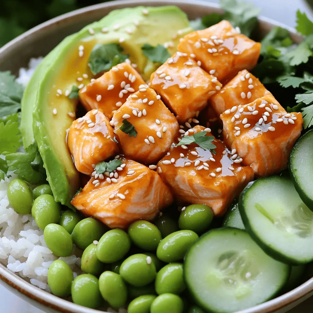 - Layering Ingredients: In serving bowls, start with a generous scoop of jasmine rice as the base. Then, add cooked salmon, 1 cup of shelled edamame, sliced avocado, cucumber, and 1/4 cup of green onions. This colorful mix makes the meal fun.