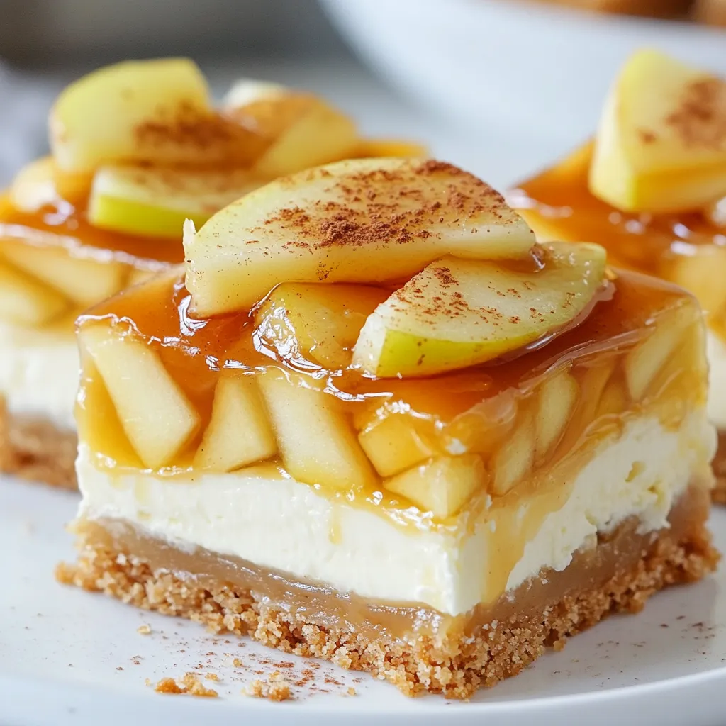 Delicious cheesecake bars with a caramel apple topping, perfect for dessert.