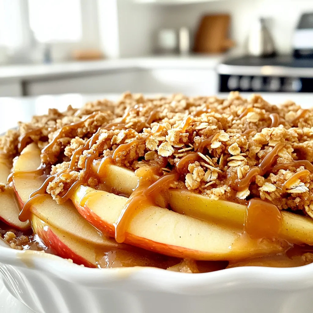 Assemble the Crisp: Sprinkle the oat topping evenly over the apples in the baking dish. Drizzle the caramel sauce over the top of the oat mixture.
