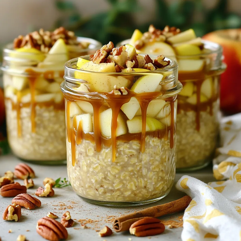 - 1 cup rolled oats - 2 cups almond milk (or your choice of milk) - 1 medium apple, diced - 2 tablespoons caramel sauce (store-bought or homemade) - 1 tablespoon chia seeds - 1 teaspoon cinnamon - 1 tablespoon honey or maple syrup (optional, adjust to taste) - Pinch of salt - Chopped nuts (e.g., pecans or walnuts) for topping (optional) For this recipe, I use one cup of rolled oats. Rolled oats absorb the liquid well and create a nice texture. I add two cups of almond milk, but you can use any milk you like. A medium apple, diced into small pieces, adds sweetness and crunch. I use two tablespoons of caramel sauce for that rich flavor. One tablespoon of chia seeds adds nutrition and makes the oats creamy. One teaspoon of cinnamon gives a warm spice. A tablespoon of honey or maple syrup is optional, for extra sweetness. Finally, I add a pinch of salt to balance the flavors. You can make this recipe your own by adding extra ingredients. Try adding dried fruit like raisins or cranberries for more flavor. You can also mix in nut butter for added creaminess. If you like a crunch, add chopped nuts like pecans or walnuts on top. You can also sprinkle some extra cinnamon or a drizzle of caramel sauce before serving for an even sweeter treat. First, gather your ingredients. You need 1 cup of rolled oats, 2 cups of almond milk, and 1 medium apple. Dice the apple into small pieces. You will also need chia seeds, cinnamon, salt, and caramel sauce. If you want a sweeter taste, grab honey or maple syrup. In a mixing bowl, add the rolled oats, almond milk, chia seeds, cinnamon, and a pinch of salt. Stir the mixture well until everything blends together. Next, fold in the diced apple and caramel sauce gently. Make sure the apple and sauce mix evenly with the oats. If you want more sweetness, add honey or maple syrup. Once your mixture is ready, divide it into two jars or airtight containers. Seal the jars tightly and place them in the fridge. Let them chill overnight, or for at least 4 hours. This time allows the oats to soak up the milk and soften. In the morning, give the oats a good stir. If your oats look too thick, add a splash of milk to adjust the texture. Enjoy your delicious caramel apple overnight oats! You can change your oats to fit your taste. Add more apples for sweetness. Try different fruits like berries or bananas. You can swap caramel sauce with nut butter for a new flavor. If you want crunch, add seeds or nuts. Mix in yogurt for creaminess. The options are endless! Serve your oats in clear jars for a great look. Top them with apple slices and chopped nuts. A drizzle of extra caramel sauce adds a sweet touch. You can also sprinkle cinnamon on top for a warm flavor. Enjoy them as a quick breakfast or snack. They are perfect for meal prep! To get the best texture, use rolled oats. They soak up the liquid well. Always mix the oats well to avoid clumps. Store them in airtight jars to keep them fresh. If they get thick, add more milk before eating. Let them chill overnight for the best flavor. {{image_2}} You can mix up the fruit in your overnight oats. Try bananas for a sweet twist. Berries add a nice tart flavor. Pears give a soft texture and are great too. Each fruit brings its own taste and fun. Just make sure to chop them small. If you want less sugar, use natural sweeteners. Agave syrup works well and is mild. Coconut sugar gives a caramel-like taste. You can also skip sweeteners altogether if you prefer. The caramel sauce already adds sweetness. Many types of milk can work here. Oat milk is creamy and pairs well with oats. Soy milk has a good protein boost. Coconut milk adds a nice tropical flair. Choose what fits your taste and diet best. To store leftover caramel apple overnight oats, place them in airtight containers. This helps keep them fresh and tasty. If you have any toppings, like nuts or extra caramel, store them separately. This keeps your oats from getting soggy. In the fridge, these oats last for about three to five days. The oats will continue to soak up the liquid, making them softer. If they seem too thick, add a splash of milk before serving. Always check for any odd smells or changes in color before you eat them. You can freeze these oats for longer storage. Place them in freezer-safe containers. Make sure to leave some space at the top. The oats will expand as they freeze. They can stay fresh for up to three months. When ready to eat, thaw them in the fridge overnight. You can reheat them in the microwave or enjoy them cold! Overnight oats are great for you! They are full of fiber, which helps digestion. The oats give you energy and keep you full. Chia seeds add healthy fats and protein, too. Apples bring vitamins and natural sweetness. With almond milk, you get calcium without dairy. Overall, overnight oats are a balanced meal! Yes, you can easily make this recipe vegan! Just use almond milk or any plant-based milk. Skip the honey and use maple syrup instead for sweetness. This way, you keep all the flavors and enjoy a tasty vegan breakfast. Overnight oats can last up to five days in the fridge. Make sure you use airtight jars. They will taste fresh and yummy for breakfast all week. If you notice any change in taste or smell, it's best to toss them out. Enjoy your oats while they are still good! To sum up, we explored the basics of making overnight oats. We covered the key ingredients, precise measurements, and fun add-ins. You learned step-by-step how to prepare and store your oats. I shared tips to customize your meals and offered serving ideas. We also discussed various fruit options and non-dairy milk choices. Overnight oats are versatile and easy to make. They provide a healthful breakfast option. Now it’s your turn to get creative and enjoy your tasty breakfasts!