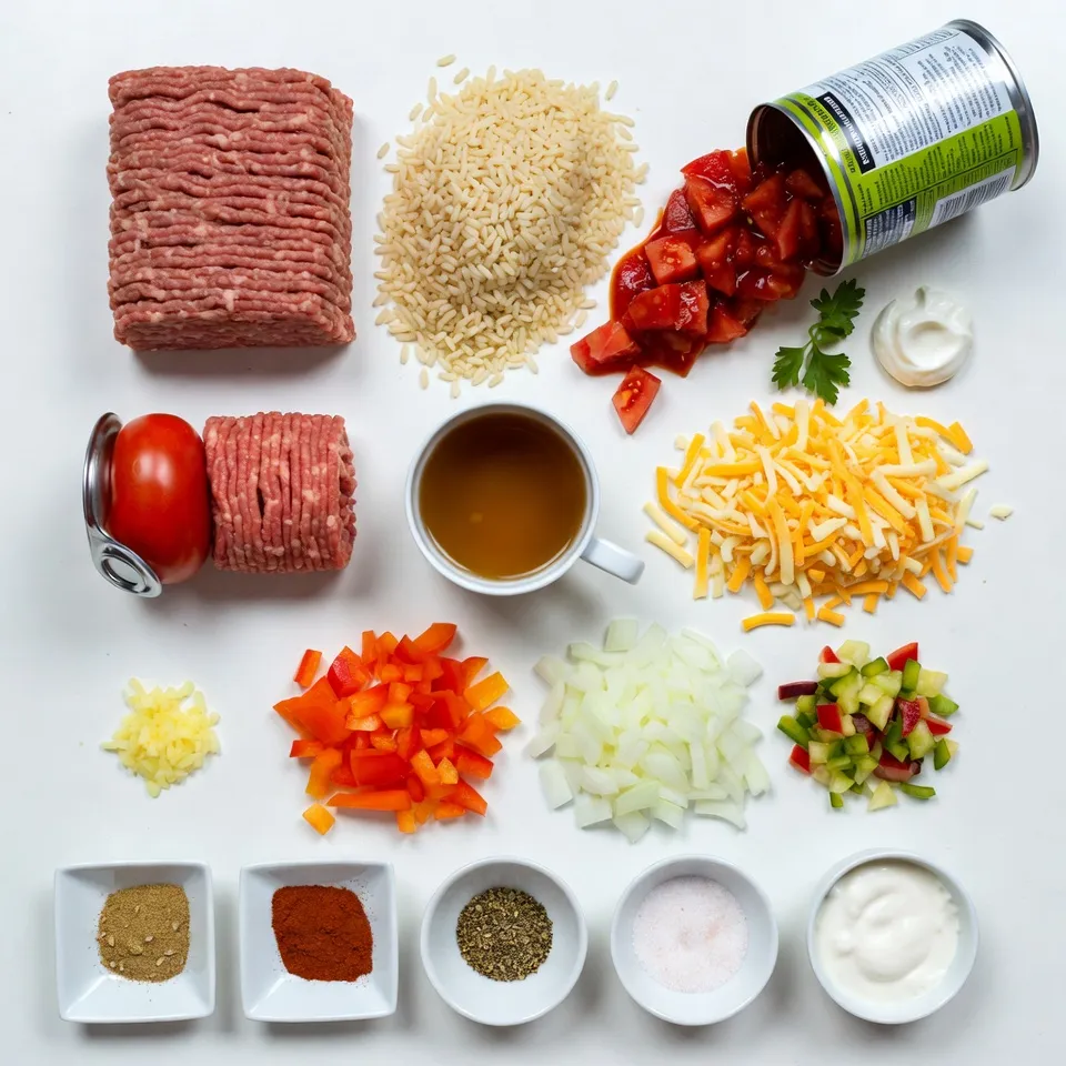 To make Cheesy Hamburger Rice Casserole, you need some key items: