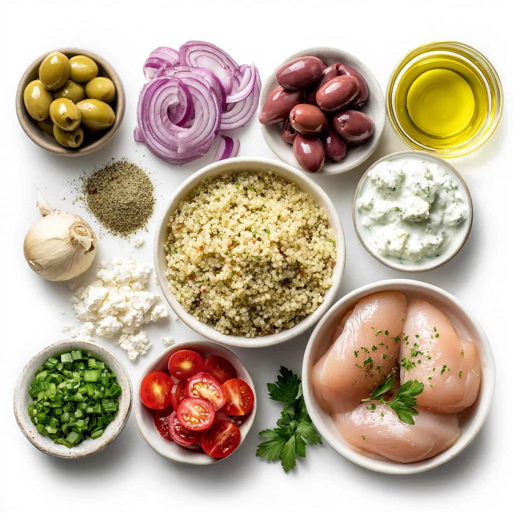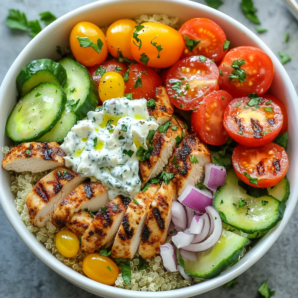 - To assemble the bowls, divide the quinoa salad among serving bowls. Top each bowl with sliced chicken, crumbled feta cheese, and a generous dollop of tzatziki sauce.