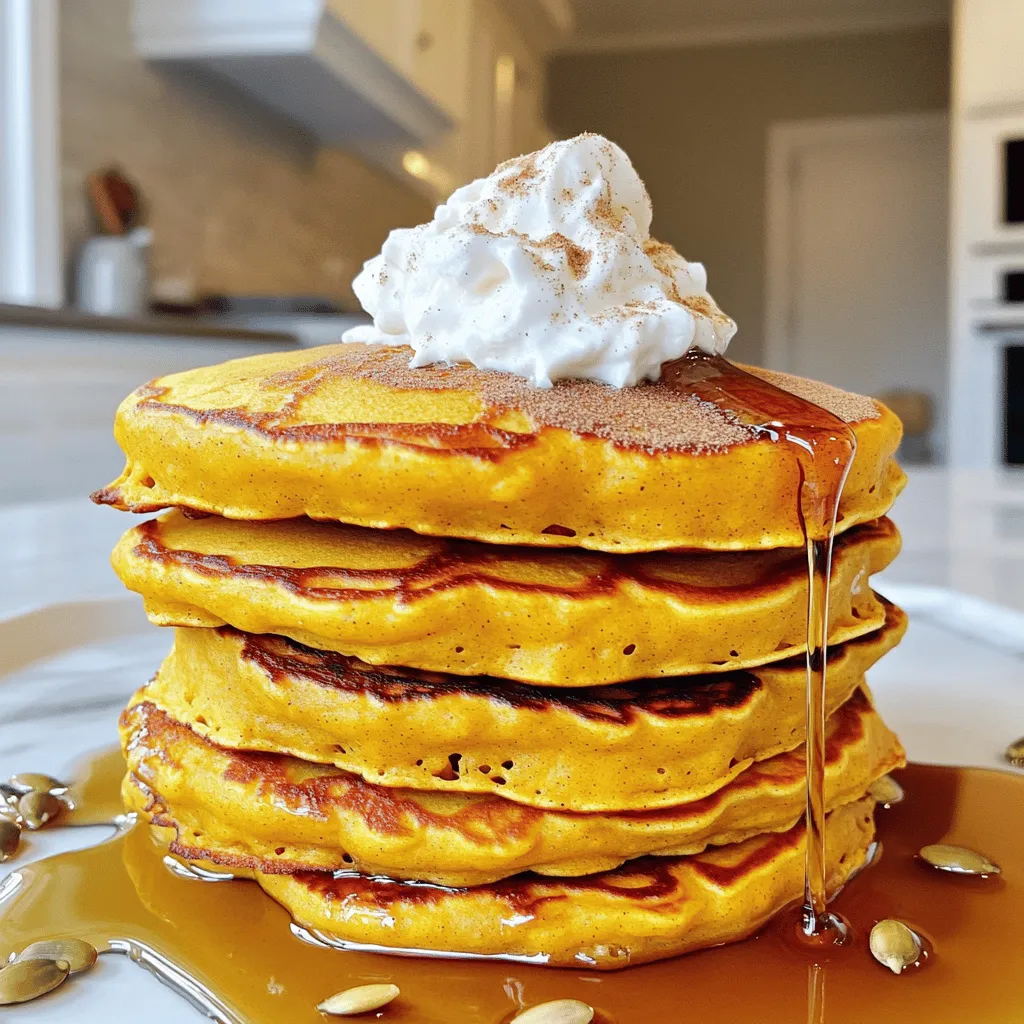 Serve your pancakes stacked high on a plate. Drizzle extra maple syrup on top for sweetness. A sprinkle of cinnamon adds warmth and flavor. For extra flair, top with whipped cream and a few pumpkin seeds. They add a nice crunch! You can also pair these pancakes with fresh fruit, like bananas or berries, for a tasty and colorful breakfast.
