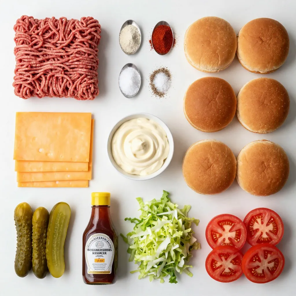 - Assemble the Burgers: Spread a generous amount of the sauce on the bottom half of each bun. Layer with shredded lettuce, a cooked patty with melted cheese, slices of tomato, and dill pickles. Top it off with the other half of the brioche bun.