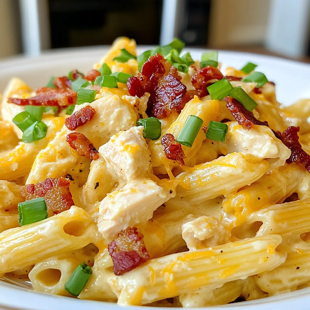For the final touch, stir in 1 cup of cooked bacon pieces and 2 sliced green onions. Cook for another 2-3 minutes until everything is heated through. Plate the Crack Chicken Penne and garnish with extra green onions or cheese, if you like. Enjoy this easy, flavorful dish!
