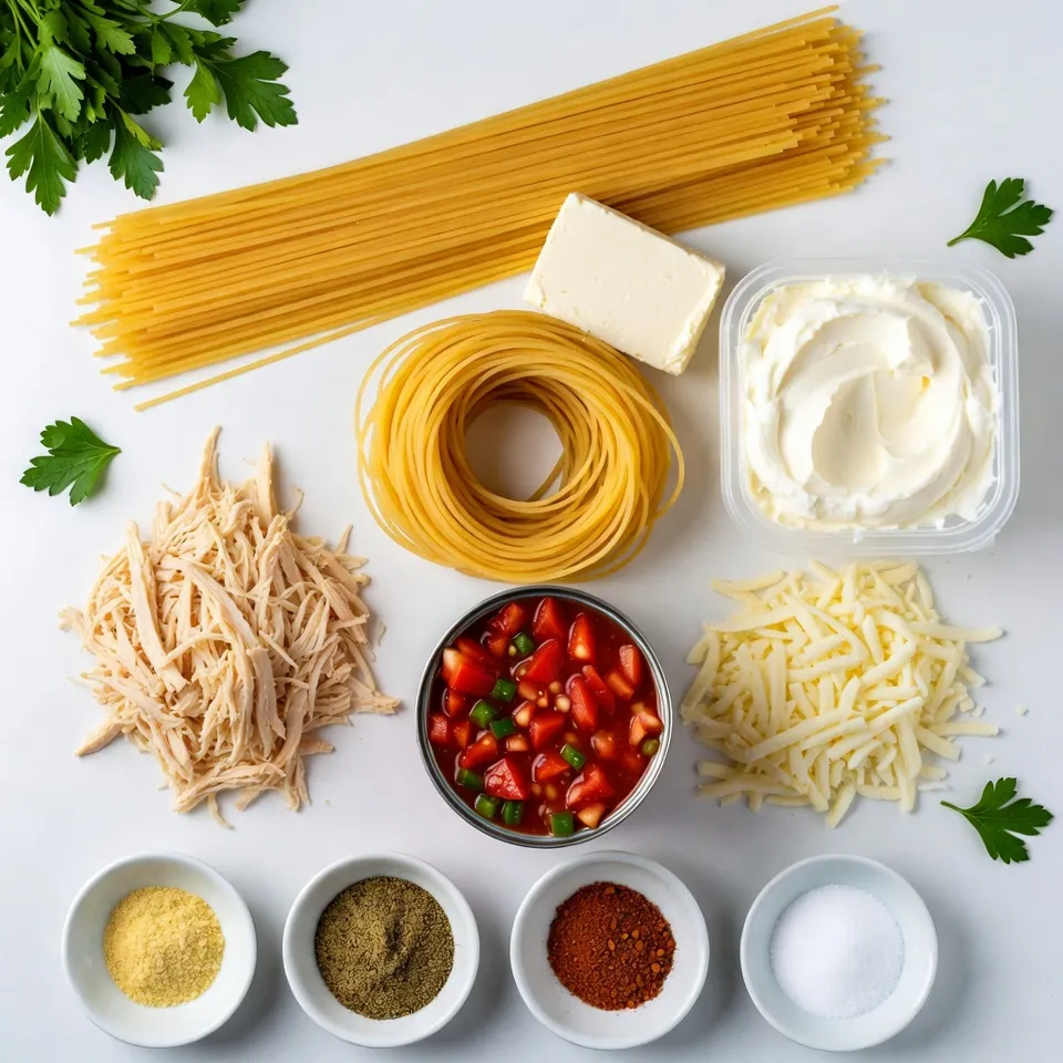 The main ingredients create the heart of the dish. Spaghetti forms a sturdy base. Cream cheese and sour cream add a rich, creamy texture. Shredded mozzarella melts beautifully, giving the dish a nice stretch. You can choose cooked chicken or ground turkey for protein.
