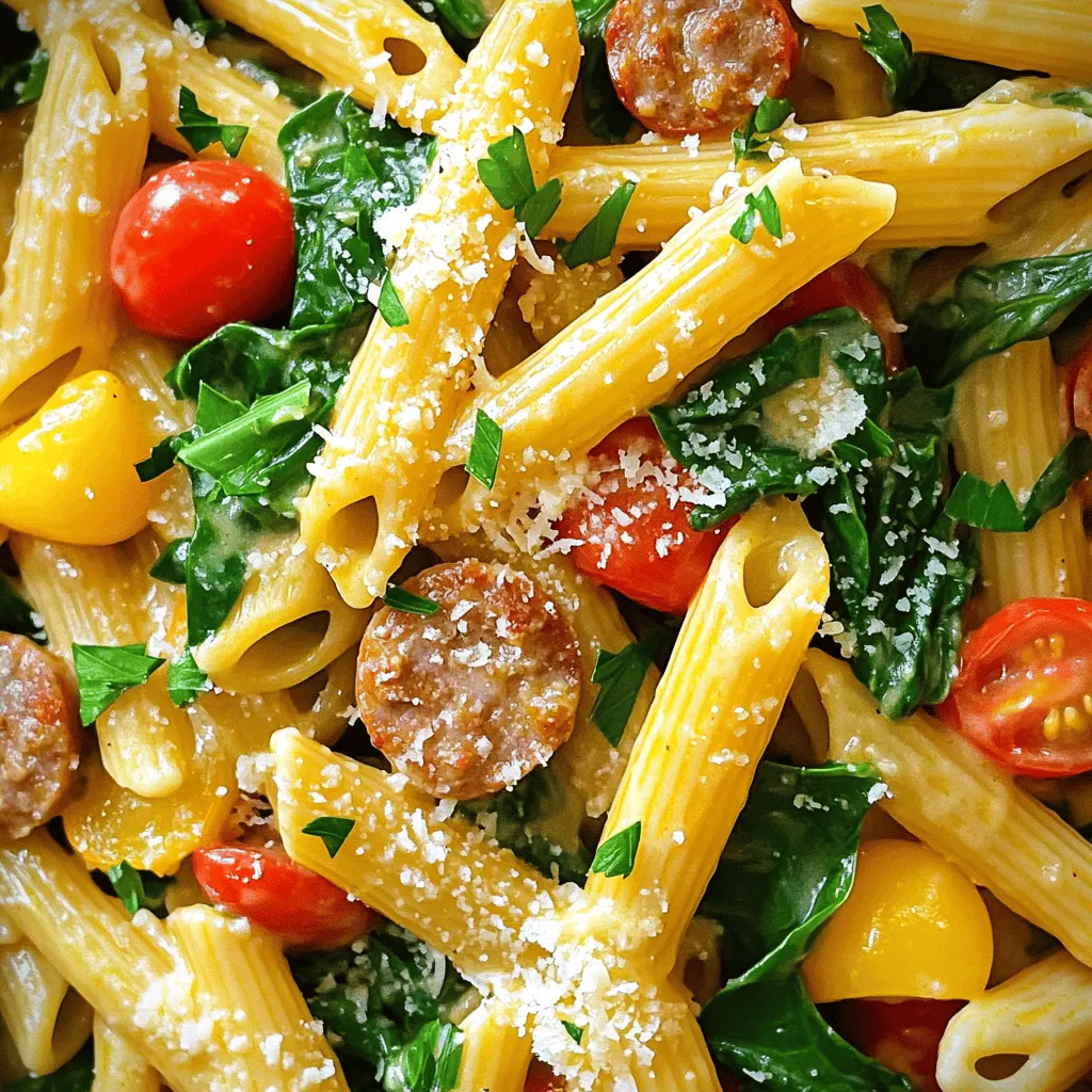 For this dish, you need: - 12 oz penne pasta - 1 lb smoked sausage, sliced - 1 bell pepper (red or green), diced - 1 small onion, chopped - 3 cloves garlic, minced - 2 cups chicken broth - 1 cup heavy cream - 1 teaspoon Cajun seasoning (adjust to taste) - 1 cup cherry tomatoes, halved - 2 cups spinach (fresh or frozen) - 2 tablespoons olive oil - Salt and pepper to taste - Grated Parmesan cheese for serving - Fresh parsley, chopped (for garnish) These ingredients work together to create a rich and creamy pasta dish. The sausage adds a nice smoky flavor. The bell pepper and onion bring sweetness and crunch. Besides Cajun seasoning, consider these: - Salt and pepper for basic seasoning. - Extra Cajun seasoning for more heat. - Fresh parsley gives color and freshness. - Grated Parmesan cheese adds a savory touch. These seasonings and garnishes elevate the dish's flavor. Adjusting the spices lets you control the heat level. You will need: - A large pot for cooking. - A cutting board for chopping. - A sharp knife for slicing. - A wooden spoon for stirring. - Measuring cups for the liquids. Having the right tools makes cooking easier. A large pot helps everything cook evenly. Start by heating two tablespoons of olive oil in a large pot over medium heat. Once hot, add 1 pound of smoked sausage, sliced into rounds. Cook this for about 5-6 minutes until it gets a nice brown color. This step adds great flavor. Next, add one diced bell pepper, one chopped small onion, and three cloves of minced garlic. Sauté these for 3-4 minutes until the vegetables soften and smell amazing. Don't forget to stir often to keep everything cooking evenly. After the sausage and veggies are ready, it's time for the pasta. Pour in 2 cups of chicken broth and bring this mixture to a boil. Once boiling, add 12 ounces of penne pasta. Lower the heat to a simmer and cover the pot. Let it cook for 10-12 minutes, stirring occasionally. This is when the pasta absorbs the broth's flavor. Check it for doneness; it should be al dente, which means it’s still firm to the bite. Now, stir in 1 cup of heavy cream, 1 cup of halved cherry tomatoes, and 2 cups of spinach. Cook for another 3-4 minutes until the spinach wilts and everything heats through. The cream will make the dish rich and smooth. Taste your pasta and season with salt and pepper as needed. Adjust the Cajun seasoning if you want more heat. Once everything is well mixed, serve it hot. Top with grated Parmesan cheese and a sprinkle of fresh parsley for a colorful finish. To get great flavor, use fresh Cajun seasoning. Mix it well with the sausage. Sauté it for one minute to bloom the spices. You can adjust the amount based on your taste. More spice gives a nice kick, while less makes it milder. Try different brands to find your favorite. For perfect pasta, follow the cooking time on the package. Stir it often while it cooks. Check the pasta a minute or two before the time is up. It should be al dente, firm yet tender. The pasta will continue to cook a bit when you mix in the cream. To boost creaminess, use full-fat heavy cream. This adds richness to your dish. Stir in the cream slowly, letting it blend well. You can also add a splash of pasta water if needed. This keeps the sauce smooth and helps it cling to the pasta. Grated Parmesan cheese adds a nice touch at the end. {{image_2}} You can swap the smoked sausage for other meats. Chicken or turkey sausage works well. If you like a spicy kick, try andouille sausage. You can also use kielbasa for a different taste. For veggies, bell peppers are a great choice, but you can add zucchini or mushrooms. They bring great flavor and texture to the dish. Cajun seasoning gives this dish its unique flair. If you want a milder taste, use Italian seasoning instead. A hint of paprika can add a nice smokiness. For a fresh zing, toss in some lemon zest. This change brightens the dish without losing its creamy goodness. To make this dish vegetarian, replace the sausage with plant-based options. You can use mushrooms or lentils for protein. For gluten-free pasta, penne made from rice or quinoa works perfectly. Just check the package for cooking times, as they may differ from regular pasta. Enjoying this meal without meat or gluten is easy and still delicious! To store your Creamy Cajun Sausage One Pot Pasta, first let it cool. Place the pasta in an airtight container. This keeps it fresh and prevents drying out. You can store it in the fridge for up to three days. Make sure it is sealed well to keep the flavors intact. When it's time to reheat, do it gently. Use a pot on low heat, adding a splash of chicken broth or cream. Stir often to heat evenly. This helps keep the pasta creamy and avoids drying. You can also use the microwave, but cover the dish to trap steam. Heat in short bursts, stirring in between. For longer storage, you can freeze your pasta. First, let it cool completely. Then, pack it in a freezer-safe container or bag. Be sure to remove as much air as possible. It can last up to three months in the freezer. When ready to eat, thaw in the fridge overnight before reheating. This method helps keep the flavors fresh and delicious. You can serve this dish with a simple side salad. A fresh green salad pairs well. Try adding crusty bread to soak up the creamy sauce. Garlic bread is another great option. You could also serve it with roasted vegetables for a colorful plate. If you want something lighter, try a cucumber or tomato salad. Yes, you can prepare the pasta ahead of time. Cook the pasta and sauce, then let it cool. Store it in an airtight container in the fridge. It will stay fresh for up to three days. When you are ready to eat, reheat it on the stove. Add a splash of cream or broth to keep it creamy. To make it milder, use less Cajun seasoning. You can start with half a teaspoon. Taste it as you cook and add more if needed. If you want it spicier, add more Cajun seasoning or a dash of hot sauce. Fresh jalapeños can also 