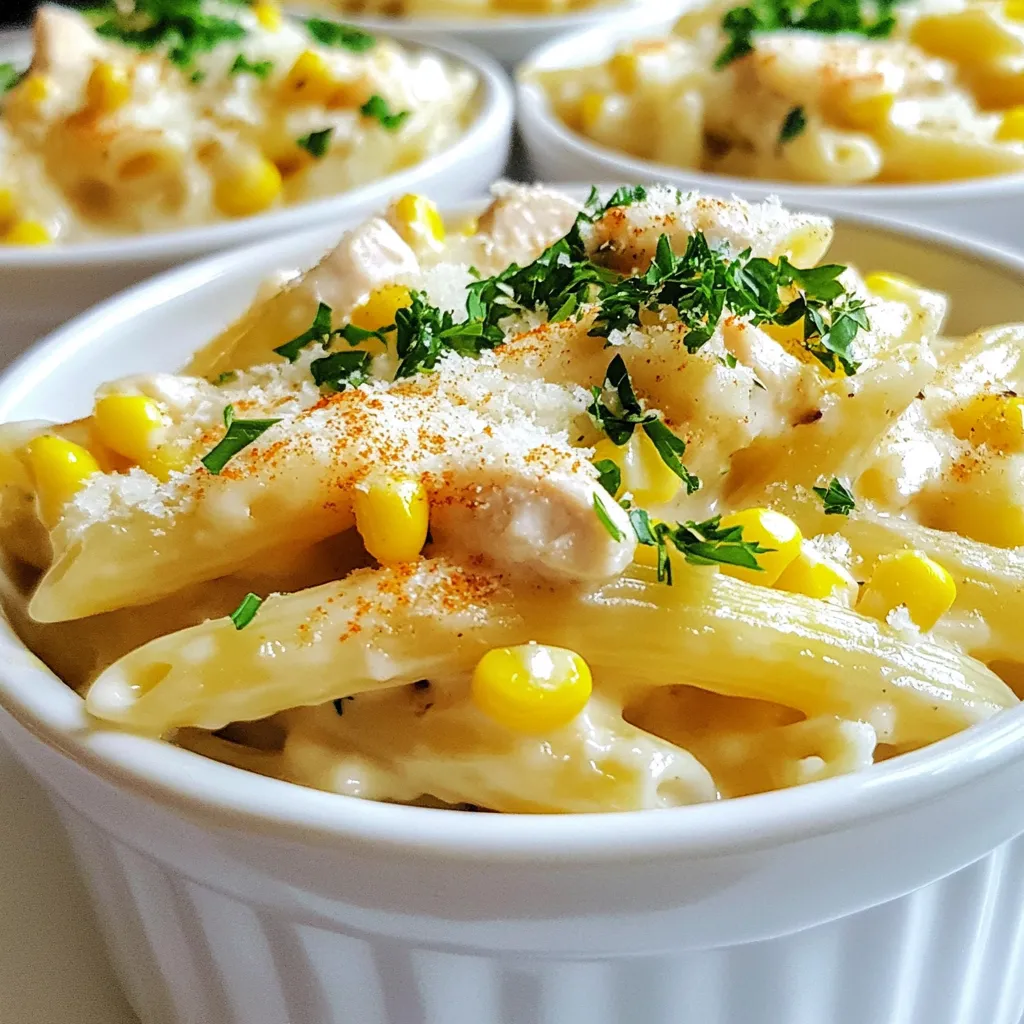 - 250g penne pasta - 1 tablespoon olive oil - 2 chicken breasts, diced - Salt and pepper to taste - 1 cup sweet corn (fresh or frozen) - 3 cloves garlic, minced - 1 cup heavy cream - 1 teaspoon dried oregano - 1 teaspoon smoked paprika - 1/2 cup grated Parmesan cheese - Fresh parsley, chopped (for garnish) When making creamy chicken and corn pasta, the right ingredients matter. Each one plays a big role in making the dish tasty. Penne pasta is perfect as it holds the sauce well. Use olive oil to cook the chicken, which adds flavor. Chicken breasts give protein and a nice texture. Season the chicken with salt and pepper to enhance its taste. Sweet corn adds a pop of sweetness. You can use fresh or frozen corn. Garlic is essential; it brings in a rich aroma. The heavy cream turns the dish creamy and rich. Dried oregano and smoked paprika give depth and warmth to the sauce. Finally, Parmesan cheese adds a cheesy finish. Don't forget the fresh parsley to brighten the dish with color and flavor. Understanding these ingredients helps you craft a comforting and delicious meal. {{ingredient_image_1}} To start, bring a large pot of salted water to a boil. Add 250g of penne pasta. Cook it according to the package instructions until it's al dente, which means it should still have a little bite. This usually takes about 8-10 minutes. Once cooked, drain the pasta but save 1/2 cup of that pasta water. It helps later with the sauce. Next, heat 1 tablespoon of olive oil in a large skillet over medium heat. Add 2 diced chicken breasts to the skillet. Season them with salt and pepper to taste. Cook the chicken for about 6-8 minutes. You want it to be fully cooked and golden brown. This color adds flavor and looks great in the dish. After the chicken is ready, remove it from the skillet and set it aside. In the same skillet, add 1 cup of sweet corn and 3 minced cloves of garlic. Sauté this mix for about 2-3 minutes. You want the corn to be tender and the garlic to become fragrant. Fresh garlic gives a nice flavor boost. Now, pour in 1 cup of heavy cream into the skillet. Stir it well with the corn and garlic. Then add 1 teaspoon of dried oregano and 1 teaspoon of smoked paprika. Let this mixture simmer for about 3 minutes. This will help the sauce thicken slightly and develop rich flavors. Return the cooked chicken to the skillet along with the drained pasta. Mix everything together well and slowly add the reserved pasta water. This helps to achieve your desired creaminess. The pasta water also helps the sauce stick to the pasta. Finally, stir in 1/2 cup of grated Parmesan cheese until it melts into the sauce. This adds a rich, cheesy flavor. Taste the dish and adjust the seasoning with more salt and pepper if needed. Serve your creamy chicken and corn pasta right away. Enjoy! - Achieving the perfect creaminess: To get that smooth and rich sauce, start with heavy cream. Heat it gently to avoid curdling. Stir in your grated Parmesan as the last step. This adds flavor and helps make the sauce creamy. If it’s too thick, add some of the reserved pasta water until you reach your desired texture. - Adjusting seasoning for personal taste: Taste your sauce before serving. You can always add more salt, pepper, or spices. If you love heat, consider adding a touch of red pepper flakes. For a hint of freshness, try squeezing a little lemon juice before serving. - Presentation ideas for a beautiful dish: Serve your creamy chicken and corn pasta in wide bowls. A sprinkle of extra Parmesan on top adds a nice touch. Add a sprig of parsley for color. A dash of smoked paprika also makes the dish pop. - Pairing options: This pasta goes well with a simple green salad. A light vinaigrette can balance the creaminess. Fresh bread, like a baguette or garlic bread, makes a great side too. It’s perfect for soaking up the sauce. - Essential tools needed for preparation: You will need a large pot for boiling pasta. A large skillet is great for cooking the chicken and sauce. A wooden spoon helps mix everything well. Don’t forget measuring cups and spoons for accuracy. - Recommended cookware for optimal results: Use a nonstick skillet for easy cooking and cleaning. A pot with a wide base helps the pasta cook evenly. Consider a good quality knife for dicing the chicken and garlic finely. These tools make the process smoother and more enjoyable. Pro Tips Use Fresh Ingredients: Whenever possible, use fresh corn and herbs to enhance the flavor and texture of your dish. Adjust Creaminess: If you prefer a creamier pasta, add more reserved pasta water gradually until you reach your desired consistency. Perfectly Cooked Chicken: Ensure the chicken is cooked through by checking that it reaches an internal temperature of 165°F (75°C). Cheese Variations: Experiment with different cheeses like mozzarella or goat cheese for a unique twist on flavor. {{image_2}} You can switch out the chicken for shrimp or tofu. Both options give great flavor. Shrimp cooks fast and adds a nice touch. Tofu, on the other hand, is a great choice for a plant-based meal. For pasta, you can choose gluten-free versions or whole grain. Both options work well with the creamy sauce. To make your dish even tastier, add spices or herbs. Fresh basil or thyme can brighten the flavors. A pinch of red pepper flakes adds a nice kick. You can also add in more veggies, like spinach or bell peppers, for extra nutrition. If you want more protein, toss in some cooked bacon or chickpeas. To make this dish low-calorie, use light cream or a milk alternative. You can also cut back on cheese or use a low-fat version. For vegetarian options, skip the chicken and use more veggies. For a vegan twist, replace the heavy cream with coconut milk and use nutritional yeast for a cheesy flavor. To store your creamy chicken and corn pasta, let it cool first. Place it in an airtight container to keep it fresh. You can store it in the fridge for up to three days. If you want to save it longer, co