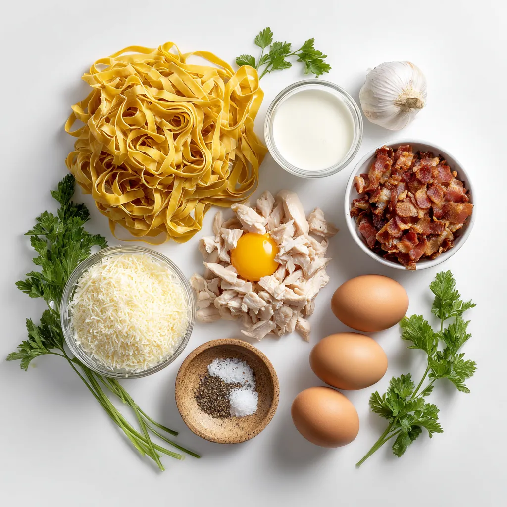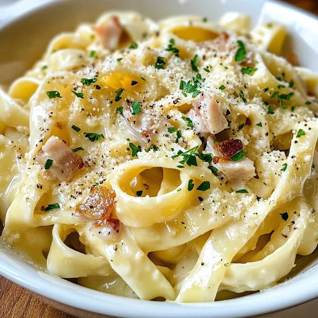 - 12 oz fettuccine pasta - 1 lb boneless, skinless chicken breast, diced - 4 oz pancetta or turkey bacon, diced - 1 cup heavy cream - 1 cup grated Parmesan cheese - 3 cloves garlic, minced - 1 teaspoon black pepper - Salt to taste - Fresh parsley, chopped When I make creamy chicken carbonara, I always think about the main ingredients first. Fettuccine pasta makes a great base. It holds the sauce well and gives that lovely texture. I like to use boneless, skinless chicken breast because it cooks evenly and stays juicy. Pancetta or turkey bacon adds a tasty, salty kick. I prefer pancetta for its rich flavor, but turkey bacon is a great lighter option. The heavy cream is what makes this dish creamy and smooth. It binds everything together perfectly. Parmesan cheese is a must; it brings in that savory umami flavor. Next, let’s talk about the seasonings. Garlic is essential. It adds depth and aroma. I usually use three cloves for a nice, bold taste. Black pepper gives that hint of spice, while salt brings out all the flavors. Finally, I love garnishing with fresh parsley. It adds color and a fresh taste that brightens the dish. Gather these ingredients, and you’re well on your way to making a delicious creamy chicken carbonara! {{ingredient_image_1}} To cook fettuccine al dente, bring a large pot of salted water to a boil. Add the fettuccine and cook based on the package directions. Al dente means the pasta is firm when bitten. This texture holds up well with sauce. After cooking, reserve one cup of pasta water before draining. This water helps adjust the sauce later. Start by cooking pancetta or turkey bacon in a large skillet over medium heat. Cook it for about five minutes until it is crispy. Remove it from the pan and set it aside. In the same skillet, add diced chicken. Season it with salt and black pepper. Cook the chicken until it turns golden and is no longer pink, about seven to eight minutes. Add minced garlic and sauté for one to two more minutes. This step enhances the flavor. In a bowl, whisk together two large eggs, one cup of heavy cream, and one cup of grated Parmesan cheese until the mix is smooth. Timing is key here. You want to combine this mixture with the pasta and chicken quickly to avoid scrambling the eggs. Add the cooked fettuccine to the skillet with chicken and pancetta. Remove the skillet from heat. Pour in the egg and cream mixture right away. Stir quickly to combine everything well. The heat will gently cook the eggs, creating a creamy sauce. If the sauce becomes too thick, add some reserved pasta water a little at a time. Adjust it until you reach your desired consistency. To keep your sauce from getting too thick, add reserved pasta water slowly. This water helps thin the sauce without losing flavor. Stir while adding to find the right texture. To enhance flavor, use fresh garlic and high-quality Parmesan. Fresh ingredients make a big difference. Don’t rush the cooking process; let the chicken brown well. This adds depth to the dish. For plating, use shallow bowls to show off the creamy sauce. Make sure the pasta sits in a nice pile, covered with sauce. Top each serving with extra Parmesan for a rich look. Garnish with fresh parsley for color and flavor. A sprinkle of black pepper adds a nice touch too. These small details make your dish more appealing. Refrigerate leftovers in airtight containers. This keeps them fresh for up to three days. When reheating, use a pan over low heat. Add a splash of cream or water to restore creaminess. Use glass or BPA-free containers for storage. They hold up well and won’t affect the taste. Proper storage helps maintain the quality of your creamy chicken carbonara. Pro Tips Use Fresh Ingredients: Fresh ingredients, especially high-quality chicken and real Parmesan cheese, will enhance the flavor and texture of your carbonara. Perfect Pasta Cooking: Make sure to cook the fettuccine just until al dente, as it will continue to cook slightly when combined with the sauce. Quick Mixing: Combine the pasta and sauce quickly off the heat to prevent the eggs from scrambling, ensuring a smooth and creamy finish. Customize Your Meat: Feel free to substitute the pancetta with your choice of bacon or even add vegetables for a unique twist on this classic dish. {{image_2}} Alternative proteins for chicken You can use shrimp or turkey in place of chicken. Both options add a new twist. For a heartier meal, try diced pork or beef. Each will bring a unique flavor to your dish. Vegetarian options If you want a meat-free version, use mushrooms or eggplant. These vegetables provide a nice texture. You can also add tofu for protein. Just make sure to season it well. Different types of pasta to use While fettuccine is a classic choice, you can swap it out for spaghetti or penne. Each pasta type will change the mouthfeel and presentation slightly. Try your favorite shape for a fun spin. Adding veggies like spinach or mushrooms Adding spinach or peas boosts color and nutrition. Sauté them briefly before mixing in the pasta. You can also use mushrooms for a rich, earthy flavor. They work well with the cream sauce. Incorporating different cheeses or spices Feel free to experiment with cheeses like Gouda or Pecorino. Each cheese will change the taste. For spices, try a dash of nutmeg or red pepper flakes for warmth. They can bring a new layer of flavor to your carbonara. Yes, you can make this dish without eggs. Use extra heavy cream and cheese instead. This will help create a rich and creamy sauce without eggs. If you prefer a vegan option, try silken tofu blended with nutritional yeast for creaminess. To make this dish gluten-free, choose gluten-free fettuccine pasta. Many brands offer great alternatives made from rice or corn. Check the labels to ensure they are certified gluten-free. If your sauce is not creamy, it may be due to low-quality cream or not whisking the mixture well. Make sure you use heavy cream and whisk the eggs, cream, and c