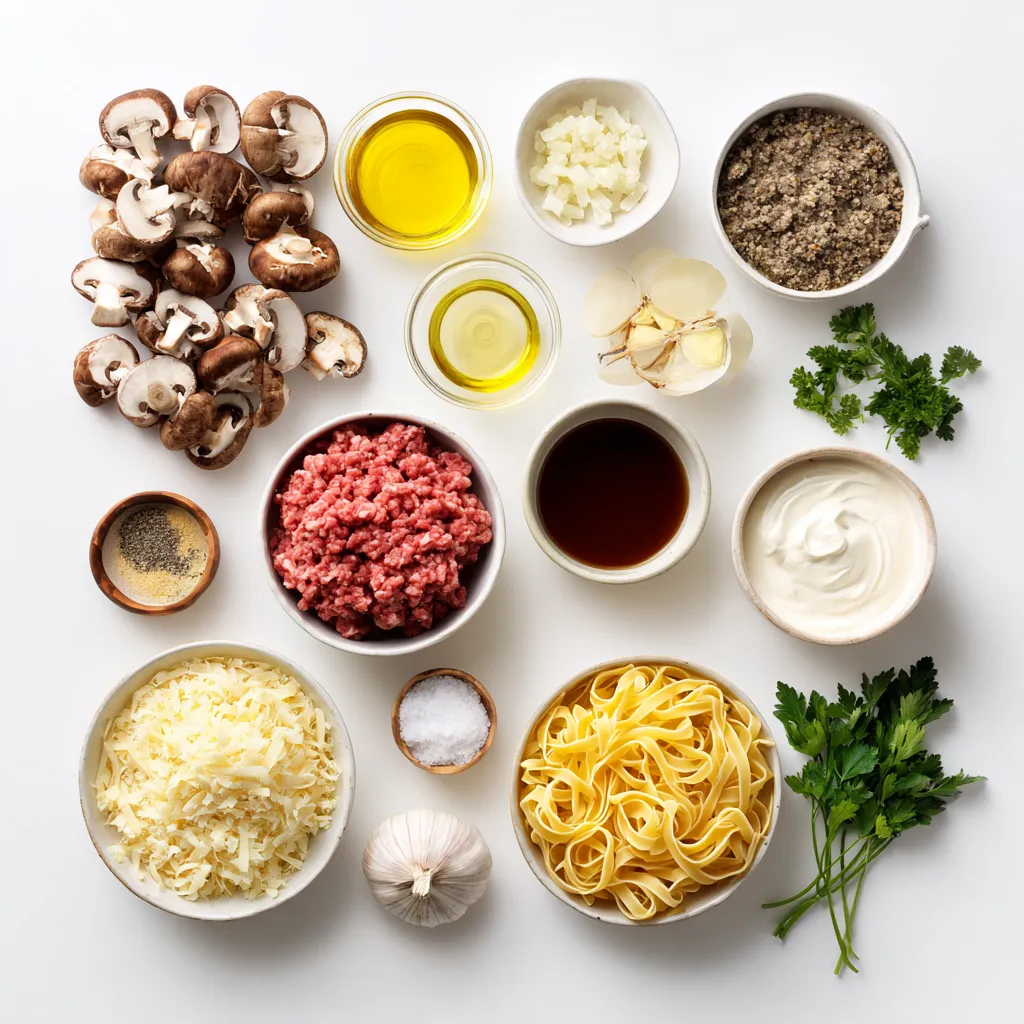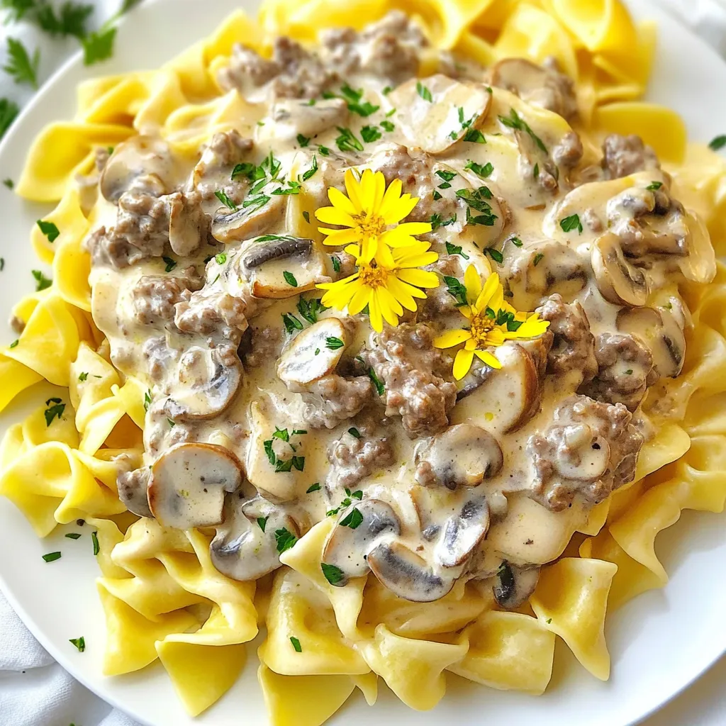 A rich and creamy dish featuring ground beef, mushrooms, and egg noodles, perfect for a comforting meal.