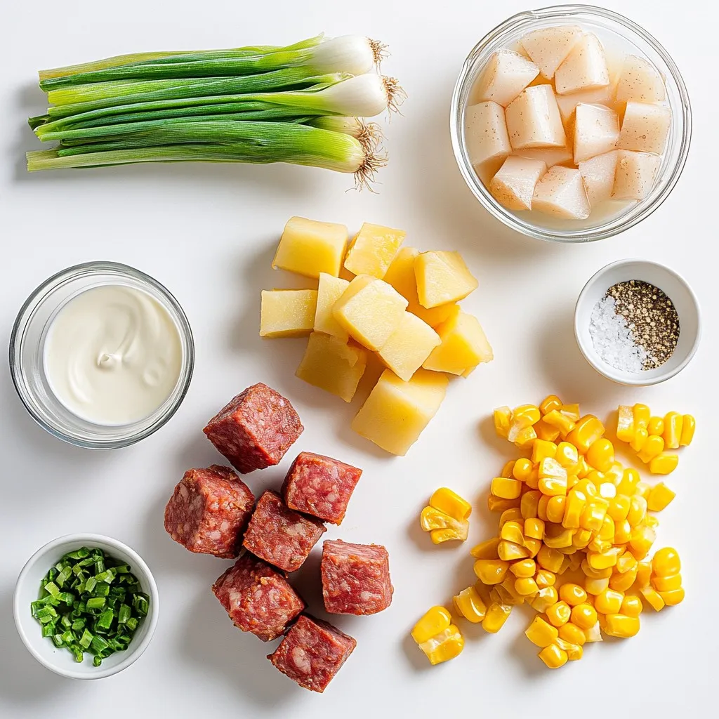 These ingredients create a creamy, hearty chowder. The onion and garlic build the base flavor. Chicken broth adds richness. Heavy cream makes it creamy and smooth. Corn adds a sweet crunch, while thyme and smoked paprika give it depth.