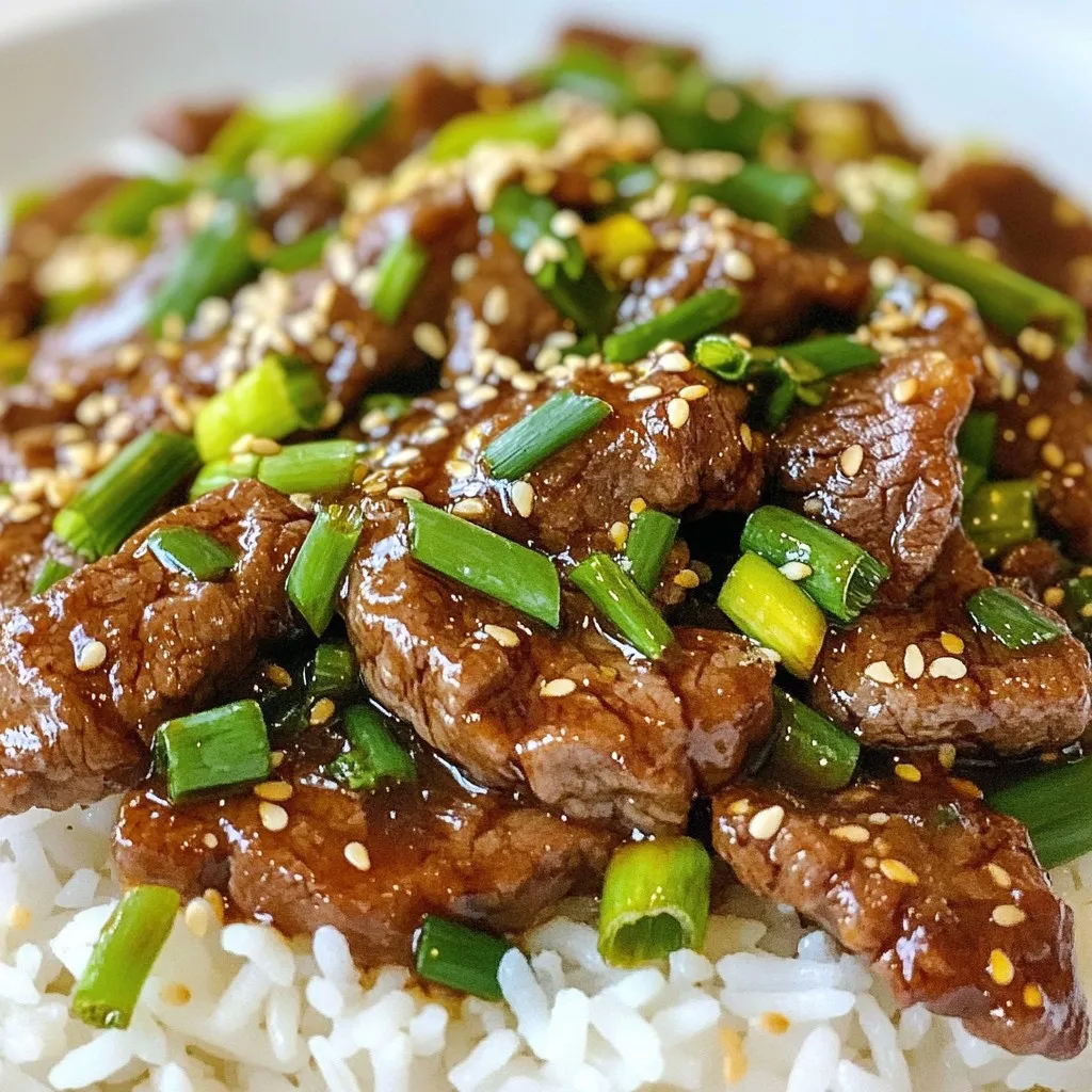Crispy Mongolian Beef shines next to rice. Jasmine rice is a perfect match. You can also serve it with fried rice for extra flavor. Consider adding steamed broccoli or green beans for color. Garnish with more green onions and sesame seeds for a pop of flavor. Want to get fancy? Try serving it in lettuce cups! It adds crunch and freshness, making it a fun option.