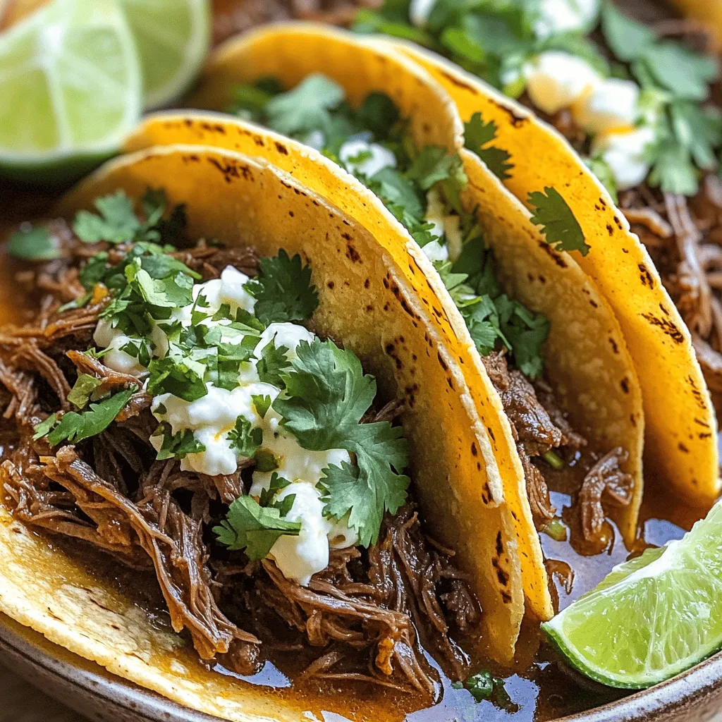 ![- 2 lbs beef chuck roast - 4 dried guajillo peppers - 2 dried ancho peppers - 4 cloves garlic, minced - 1 onion, quartered - 1 tablespoon ground cumin - 1 tablespoon dried oregano - 2 cups beef broth - 1 tablespoon apple cider vinegar - Salt and pepper to taste To make these tacos special, I suggest using fresh ingredients. The beef chuck roast gives the tacos a rich taste. The dried guajillo and ancho peppers add depth and warmth. Garlic and onion bring a savory note, while cumin and oregano add a nice kick. The beef broth keeps everything moist and tasty. This blend of flavors brings life to your meal. - Corn tortillas - Fresh cilantro, chopped - Lime wedges - Shredded mozzarella or queso fresco For the best experience, serve your tacos on warm corn tortillas. The tortillas are soft and hold the filling well. I love adding fresh cilantro for a pop of color and flavor. Lime wedges are great for squeezing over the tacos, adding zest. If you want extra creaminess, sprinkle on mozzarella or queso fresco. These toppings enhance the flavors and make your tacos even better. You can find the full recipe [here]. To start, we need to rehydrate the guajillo and ancho peppers. Boil two cups of water in a saucepan. Add the dried peppers and let them simmer for ten minutes. This softens the peppers. Once done, drain the water and let them cool. Next, we blend the sauce ingredients for flavor. In a blender, combine the softened peppers, garlic, onion, cumin, oregano, and apple cider vinegar. If the mix is too thick, add a splash of beef broth. Blend until you get a smooth sauce. Now it's time to prepare the meat. Take the beef chuck roast and season it with salt and pepper. Place the beef chunks into the crockpot. Pour the blended pepper sauce over the meat. Then, combine the sauce and beef broth in the crockpot. Make sure the meat is submerged in the liquid. This will help the beef soak up all the great flavors. You can choose how to cook your Birria tacos. Cook on low for eight hours or on high for four to five hours. The meat should be tender and shred easily when done. After cooking, remove the beef from the crockpot. Use two forks to shred the beef. Return the shredded beef to the pot so it can soak in the flavorful broth. Now, you are ready to assemble your tacos. Enjoy the rich flavor of your Birria tacos! For the full recipe, check the earlier section. To get the best flavor, use good spices and fresh ingredients. The spice blend is key. You want a mix of rich and warm flavors. This makes your birria stand out. Rehydrating dried peppers: - Start by boiling two cups of water. - Add four dried guajillo and two dried ancho peppers. - Simmer for about ten minutes. - When they soften, take them off the heat, drain, and let them cool. This method helps bring out the pepper's full taste. Use these peppers in your sauce for rich flavor. Heating corn tortillas right is very important. To do this: - Heat a skillet over medium heat. - Place the tortillas one by one for about 30 seconds on each side. This makes them soft and warm, perfect for holding your fillings. Garnishing for Presentation: - Use fresh cilantro to add color and flavor. - You can also add shredded mozzarella or queso fresco for creaminess. - Serve with lime wedges for a zesty kick. This not only looks nice but also brings out the dish's full taste. Want to explore more? Check out the Full Recipe for more tips and ideas! {{image_2}} You can swap beef with lamb, pork, or chicken for Birria. Each protein brings its unique taste. Lamb has a rich flavor that pairs well with spices. Pork is juicy and adds a slightly sweet note. Chicken is lean and absorbs flavors well. Cooking times change based on the protein. Lamb and pork may need a bit longer to cook. Chicken cooks faster, so check for doneness after 3 to 4 hours on high. Don't forget to adjust the spices to match the protein's taste. To make your Birria tacos gluten-free, use corn tortillas. They are tasty and perfect for holding the juicy filling. If you are low-carb, try lettuce wraps instead. They provide a fresh crunch and cut down on carbs. For vegetarian options, substitute the meat with jackfruit or mushrooms. Jackfruit mimics the texture of shredded meat. Mushrooms add a deep, earthy flavor. Use the same spices and cooking method for a delightful dish. After you enjoy your Crockpot Birria Tacos, store any leftovers in the fridge. First, let the food cool to room temperature. Then, place the Birria in an airtight container. This helps keep the flavors fresh. Leftovers will last about 3 to 4 days in the fridge. If you want to save some for later, freezing is a great option. Start by shredding the beef and separating the broth. Place the beef and broth in separate freezer bags. Make sure to remove as much air as possible. This helps prevent freezer burn. When you’re ready to eat, thaw the beef and broth overnight in the fridge. To reheat, warm the beef on the stove. Heat the broth in a pot until it's hot. This way, you keep the taste just like fresh. Birria tacos come from Mexico. This dish started in the state of Jalisco. It features tender meat, often beef, cooked in a rich broth. The broth is made with dried peppers, spices, and herbs. People serve the tacos with the broth on the side for dipping. This meal is a favorite at parties and celebrations. It blends culture, flavor, and history in every bite. Yes, you can cook birria tacos on the stove. Start by searing the meat in a pot. Then, add the blended sauce and beef broth. Cover and simmer on low heat for about two to three hours. Stir occasionally to avoid sticking. This method cooks the meat faster but still gives great flavor. To make birria less spicy, you can remove the seeds from the peppers before blending. You can also use fewer peppers in your recipe. Adding more beef broth can help tone down the heat. Lastly, serve the tacos with sour cream or avocado. Both can help balance the spice. Birria tacos pair well with 