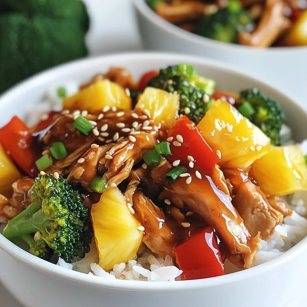 First, grab your large slow cooker. Place the boneless chicken breasts at the bottom. This forms the base for your dish. In a medium bowl, whisk together the teriyaki sauce, grated ginger, and minced garlic. Pour this mix over the chicken. Next, add the pineapple chunks, sliced red bell pepper, and broccoli florets on top. Cover the slow cooker with a lid. Cook on low for 4 hours or high for 2 hours. When done, the chicken should be tender and fully cooked. Use two forks to shred the chicken right in the slow cooker. Mix it with the sauce and veggies well. Serve this tasty mix over cooked rice or quinoa. Finish it off by sprinkling sesame seeds and chopped green onions on top.