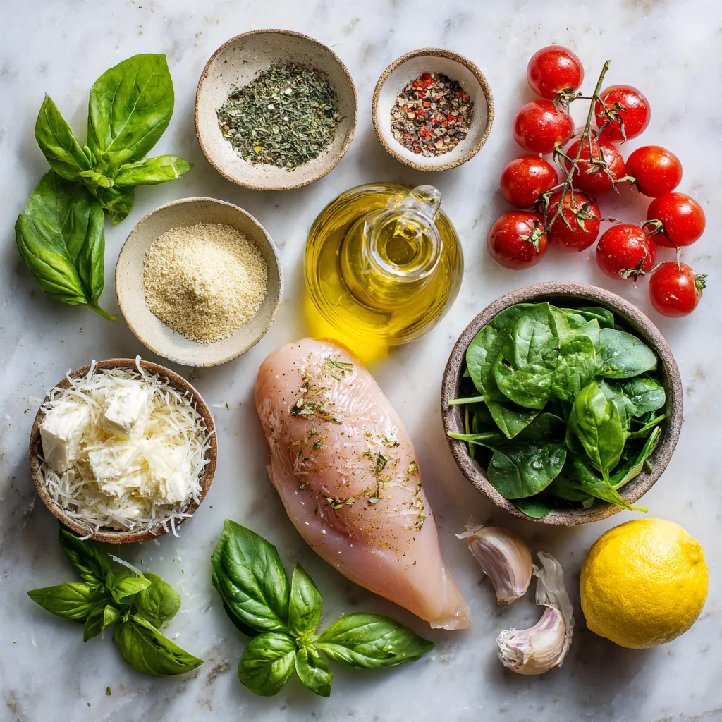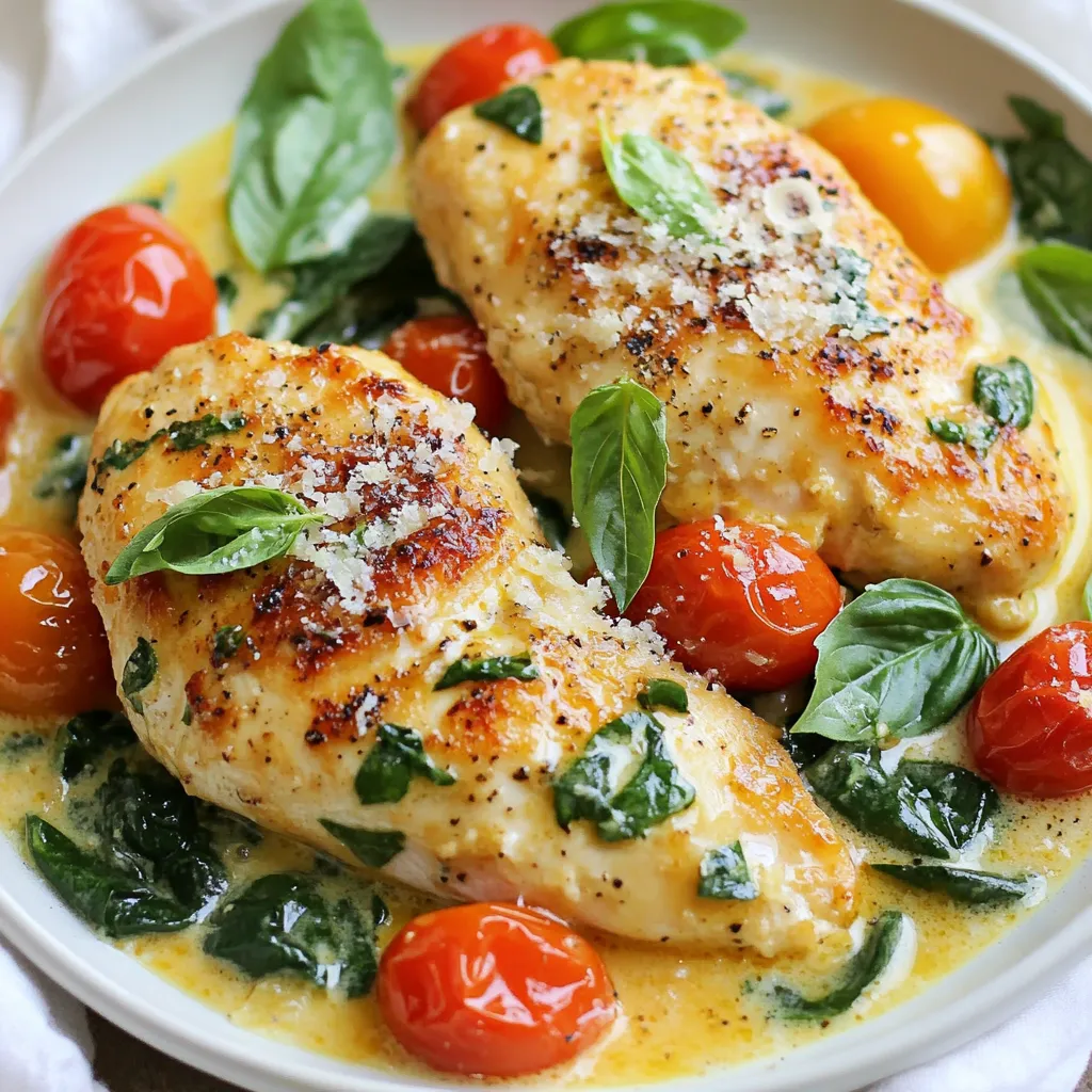 Now, use the same skillet to make your sauce. Add the halved cherry tomatoes and cook them for 2-3 minutes. They should get soft and juicy. Then, toss in the fresh spinach and cook until it wilts. This adds freshness to the sauce. Lower the heat and mix in the softened cream cheese. Stir until it melts and blends with the tomatoes and spinach. Finally, add grated Parmesan cheese and lemon juice. This creates a silky, creamy sauce that coats the chicken perfectly.