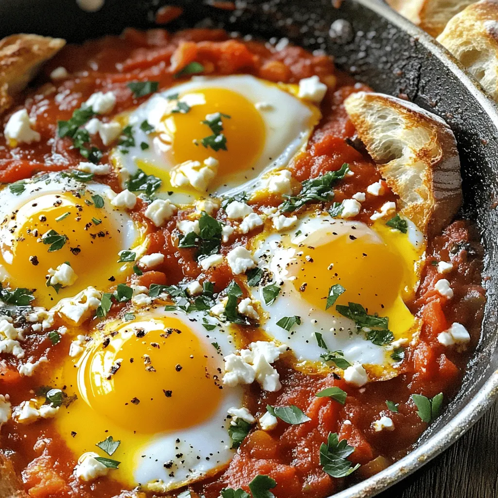 To make easy skillet shakshuka, gather these key items: - 2 tablespoons olive oil - 1 medium onion, finely chopped - 2 garlic cloves, minced - 1 red bell pepper, diced - 1 teaspoon ground cumin - 1 teaspoon paprika - 1 can (14 oz) crushed tomatoes - Salt and pepper to taste - 4 large eggs - Fresh parsley, chopped for garnish You can enhance your shakshuka with these extras: - Feta cheese, crumbled - Crusty bread, for serving Adding feta gives a nice, creamy touch. The bread is perfect for dipping, too. To cook your shakshuka, use these tools: - A large skillet - A wooden spoon - A lid for the skillet These tools make cooking easy. A skillet helps keep the flavors in one place. A lid helps the eggs cook just right. To start, gather your ingredients. You will need: - 2 tablespoons olive oil - 1 medium onion, finely chopped - 2 garlic cloves, minced - 1 red bell pepper, diced - 1 teaspoon ground cumin - 1 teaspoon paprika - 1 can (14 oz) crushed tomatoes - Salt and pepper to taste - 4 large eggs - Fresh parsley, chopped for garnish - Feta cheese, crumbled (optional) - Crusty bread, for serving Chop the onion and garlic. Dice the red bell pepper. This step makes cooking easier. Heat the olive oil in a large skillet over medium heat. Add the chopped onion. Cook it for about 5 minutes. You want it to be soft and clear. Next, stir in the minced garlic and diced red bell pepper. Cook this mix for 3-4 minutes. The pepper should be tender and the garlic fragrant. Now, sprinkle in the ground cumin and paprika. Stir well to coat the veggies with the spices. Cook for another minute. This brings out the flavors. Pour in the crushed tomatoes. Add salt and pepper to taste. Stir to mix everything. Let the mixture simmer for 10-12 minutes. You want it to thicken a bit. Make small wells in the sauce using a spoon. Crack an egg into each well. Cover the skillet. Cook until the egg whites set, about 6-8 minutes. The yolks should remain runny. Once done, remove the skillet from heat. Top with chopped parsley and crumbled feta, if you like. Serve the shakshuka hot from the skillet. Pair it with crusty bread for dipping. Enjoy the rich flavors and warm spices of this dish! To get the best eggs, you need to cook them just right. Aim for soft, runny yolks. When you crack the eggs into the sauce, cover the skillet. This helps steam the eggs. Check them after 6 minutes. If the whites are set and the yolks are wobbly, they are ready. Don’t be shy about spices! You can add more flavors to your shakshuka. Consider adding chili powder for heat or smoked paprika for depth. You might try olives or capers for a briny kick. Fresh herbs like cilantro or dill can also brighten the dish. Taste as you go, and adjust to your liking. Serve your shakshuka hot from the skillet. This makes it feel fresh and inviting. Pair it with crusty bread for dipping. A drizzle of olive oil on top adds a nice touch. Feta cheese gives a creamy contrast, but it’s optional. You can also add a side salad for freshness. Enjoy your meal with friends or family! {{image_2}} To make shakshuka vegan, swap the eggs for tofu. Use firm tofu and crumble it into the sauce. Cook it until warm, about 5 minutes. You can also add chickpeas for protein. They add a nice texture and flavor. A splash of nutritional yeast gives a cheesy taste without dairy. If you love heat, add chopped jalapeños or red pepper flakes. You can mix in a dash of hot sauce for extra kick. Adjust the spice level to your liking. Just be careful not to overpower the dish. Remember, balance is key in cooking! Toppings can transform your shakshuka. Try adding fresh herbs, like cilantro or basil, for freshness. Crumbled feta adds creaminess. Avocado slices offer richness, too. For a unique twist, drizzle tahini on top. It adds a nutty flavor that pairs well with the tomatoes. To store leftover shakshuka, let it cool first. Then, place it in an airtight container. Keep it in the fridge for up to three days. Make sure to cover the eggs gently to avoid breaking the yolks. When reheating, use a skillet for best results. Heat on low to avoid overcooking the eggs. Stir gently to warm the sauce without breaking the yolks. You can also microwave it for about one minute. Cover it with a paper towel to prevent splatters. You can freeze shakshuka, but it’s best to do so without the eggs. Store the sauce in an airtight container. It can last for up to three months in the freezer. When ready to eat, thaw it overnight in the fridge. Then, cook fresh eggs right before serving. This keeps the eggs tender and delicious. Shakshuka is a tasty dish from North Africa and the Middle East. It features eggs cooked in a spicy tomato sauce. The dish is warm, comforting, and full of flavor. You can add spices like cumin and paprika to boost the taste. It’s often served with crusty bread to soak up the sauce. This dish is great for breakfast, lunch, or dinner! Yes, you can! Shakshuka is flexible with veggies. Try adding spinach, zucchini, or mushrooms. Each vegetable will give the dish a unique twist. Just chop them up, and sauté them with the onion and bell pepper. This way, you keep the rich and savory base while adding new flavors. Feel free to experiment based on what you have at home. Serve shakshuka straight from the skillet for a fun look. It looks great with sunny eggs on top. Use a sprinkle of fresh parsley and feta for color. Pair it with crusty bread for dipping. This makes each bite even more delicious. You can also add a drizzle of olive oil to enhance the flavors. Your guests will love this warm, inviting meal. You now understand the key ingredients, preparation steps, and tips for making Shakshuka. Remember to experiment with flavors and toppings to find your perfect dish. Consider vegan options or add spice for a kick. Storing leftovers is a breeze, so make extra to enjoy later. With these steps, you can create this tasty, comforting meal anytime. Dive in, share with loved ones, and enjoy every b
