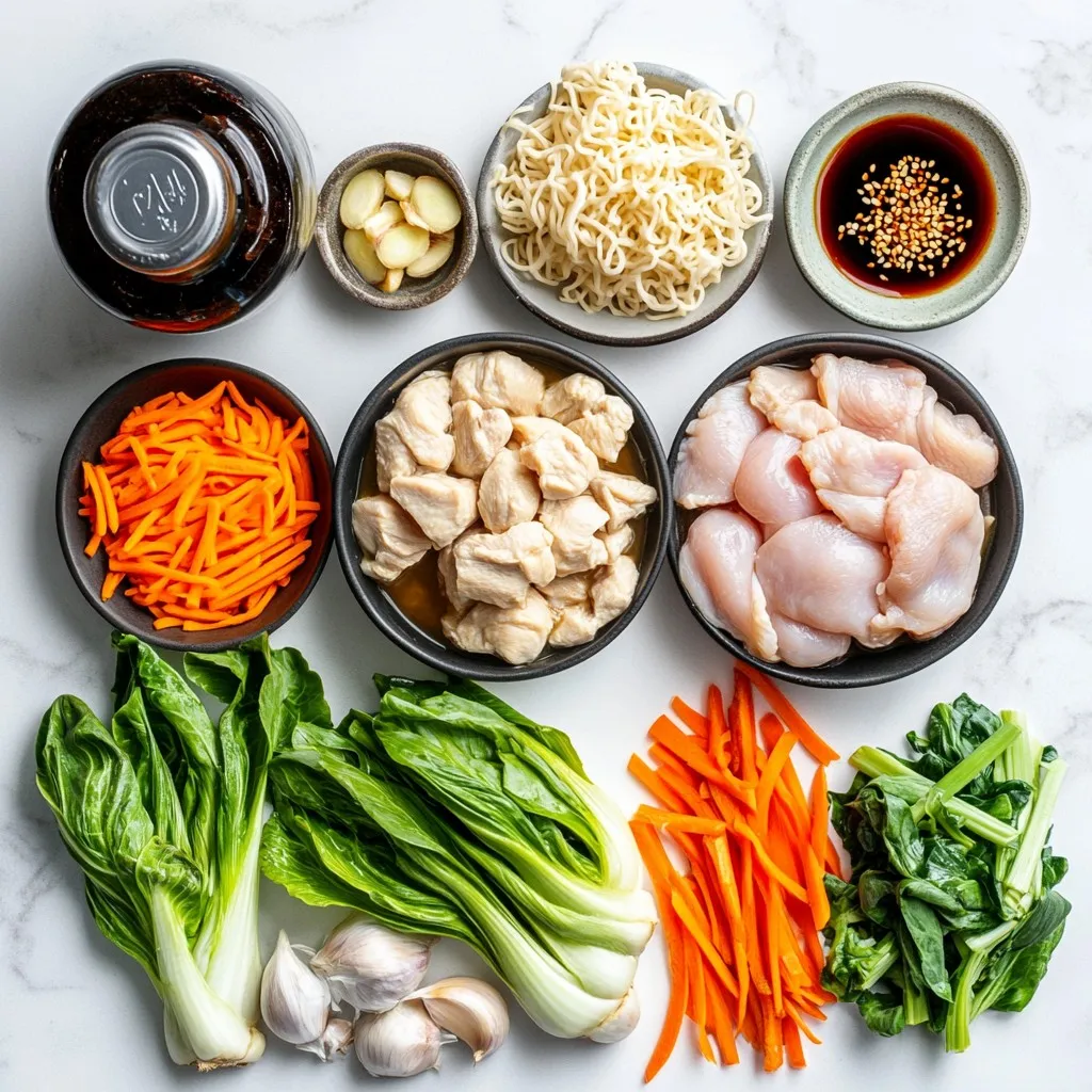 - 2 boneless, skinless chicken thighs - 1 tablespoon spicy chili paste - 1 tablespoon soy sauce - 4 cups chicken broth - 2 cloves garlic, minced - 1 tablespoon ginger, grated - 1 cup coconut milk - 2 packs of ramen noodles - 2 green onions, sliced - 1 carrot, julienned - 1 cup bok choy, chopped - 1 tablespoon sesame oil - Salt and pepper to taste - Red chili flakes for garnish This recipe starts with chicken thighs and seasonings. The chicken thighs give a rich flavor. You’ll mix them with spicy chili paste and soy sauce. Let them marinate for at least 15 minutes. This adds depth to the dish. Next, we focus on the broth and creamy components. The chicken broth is the base. Adding garlic and ginger gives it a nice kick. Coconut milk makes the broth creamy and smooth. It balances the heat from the chili paste. Now, let’s talk about the vegetables and garnishes. Bok choy adds a nice crunch. Thinly sliced green onions give color and flavor. You can also add julienned carrots for a touch of sweetness. Finish your bowl with red chili flakes for an extra spicy touch. Gather these ingredients for a bowl of Fiery Chicken Ramen with Creamy Garlic Broth. You will love this dish! {{ingredient_image_1}} Marination process First, take your chicken thighs and place them in a mixing bowl. Add one tablespoon of spicy chili paste and one tablespoon of soy sauce. Season them with salt and pepper. Mix everything well. Let the chicken marinate for at least 15 minutes. This step adds great flavor to the meat. SautΓ©ing garlic and ginger While the chicken marinates, grab a large pot. Heat one tablespoon of sesame oil over medium heat. Add two cloves of minced garlic and one tablespoon of grated ginger. SautΓ© them for about one minute. You want them to be fragrant but not burnt. This will set the base for your broth. Combining ingredients in the pot Now, add the marinated chicken thighs to the pot. Cook them for about 4-5 minutes until they turn brown on both sides. Pour in four cups of chicken broth and bring it to a simmer. Cover the pot and let it cook for about ten minutes. This allows the chicken to cook through and infuse flavor into the broth. Shredding the chicken Once the chicken is cooked, remove it from the pot. Use two forks to shred the chicken into bite-sized pieces. Set it aside for later. This shredded chicken will be a tasty topping for your ramen. Cooking noodles and vegetables Add two packs of ramen noodles to the pot. Cook them according to the package instructions, usually 3-5 minutes. After the noodles are cooked, stir in one cup of chopped bok choy and let it cook for an additional minute. This will wilt the bok choy and add a fresh crunch. Plating and garnishing To serve, ladle the creamy garlic broth with noodles into bowls. Top each bowl with the shredded chicken, some julienned carrot, and slices of green onion. For an extra kick, sprinkle red chili flakes on top. This adds a nice touch of heat and color to your dish. For the best chili paste, I recommend using brands like Sambal Oelek or Sriracha. They add the right heat and flavor. When choosing chicken broth, look for low-sodium options. This lets you control the salt better. If you need a substitute for chili paste, try red pepper flakes or hot sauce. For a dairy-free version, use almond milk instead of coconut milk. To shred chicken easily, use two forks. Hold one fork in the chicken and pull with the other. This gives you nice, thin pieces. Another method is to use your hands if the chicken is cool enough. For stirring, use a wooden spoon. This helps prevent the noodles from sticking. Stir gently and often while cooking to keep everything even. Pro Tips Marinate for Maximum Flavor: Allowing the chicken to marinate for at least 15 minutes helps to infuse it with the spicy and savory flavors of the chili paste and soy sauce. Use Fresh Ingredients: Fresh garlic and ginger can significantly enhance the overall flavor of your broth, so opt for fresh over powdered or jarred ingredients when possible. Adjust Spice Levels: If you prefer a milder dish, reduce the amount of chili paste and red chili flakes. You can always add more to your individual bowl for an extra kick! Customize Your Toppings: Feel free to add other toppings like soft-boiled eggs, nori, or bean sprouts for extra texture and flavor to your ramen bowls. {{image_2}} Making it gluten-free You can easily make this ramen gluten-free. Choose gluten-free ramen noodles. Also, use tamari instead of soy sauce. This way, you keep the taste while avoiding gluten. Vegetarian or vegan adaptations To create a vegetarian or vegan version, swap chicken for tofu or tempeh. Use vegetable broth instead of chicken broth. For the creamy touch, replace coconut milk with a non-dairy cream. Add a few mushrooms for a meaty texture and flavor. Different spice levels Adjust the heat to fit your taste. Use less chili paste for a milder ramen. You can add more red chili flakes for extra heat. Experiment with different spices like sriracha or harissa. Each will give the dish a unique twist. Adding extra toppings Enhance your ramen with fun toppings. Try adding soft-boiled eggs for richness. Sesame seeds add crunch, while nori sheets bring umami. You can toss in bean sprouts or sliced radishes for freshness. The more toppings, the more flavor and texture! To keep your Fiery Chicken Ramen fresh, store it in the fridge. Place the ramen in an airtight container. It stays good for about 3 days. If you want to save it for longer, freezing is a great option. You can freeze the broth and chicken for up to 2 months. Just make sure to seal it well to avoid freezer burn. When it comes to reheating, you have two options: microwave or stovetop. If you use the microwave, heat it in short bursts. Stir between each burst for even warmth. The stovetop is a great choice too. Just pour it into a pot over medium heat and stir gently. To keep the broth creamy, add a splash of coconut milk while reheating. This 