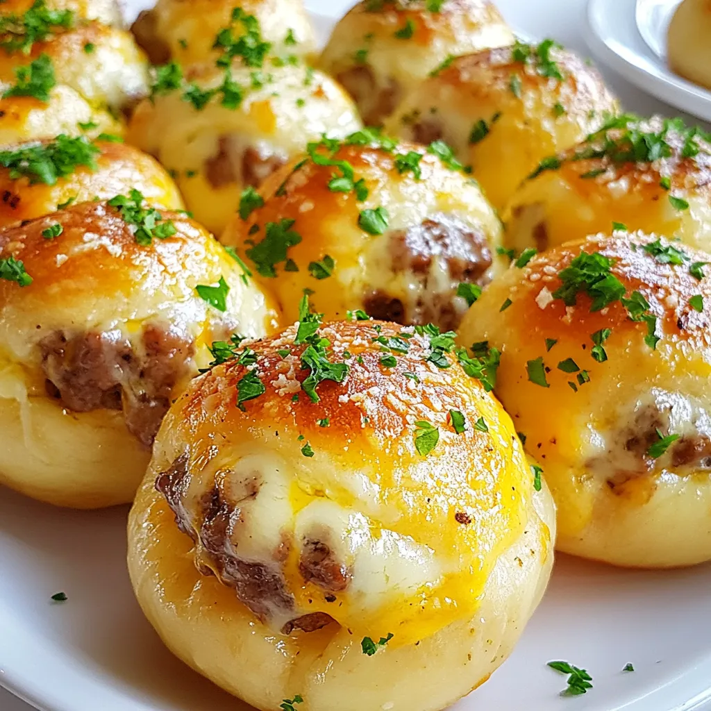 - 1 pound ground beef - 1 cup shredded cheddar cheese - 1/2 cup grated Parmesan cheese - 1 tablespoon garlic powder - 1 teaspoon onion powder - 1 teaspoon salt - 1/2 teaspoon black pepper The stars of this dish are ground beef and two cheeses. The ground beef gives a rich flavor. Cheddar adds creaminess, while Parmesan brings a sharp bite. Seasonings like garlic and onion powders boost the taste. - 1 package refrigerated pizza dough (about 16 oz) - 1/4 cup fresh parsley, chopped - 1 tablespoon olive oil - 1 tablespoon melted butter Refrigerated pizza dough is easy and quick. It gives a nice, flaky crust. Fresh parsley adds color and a fresh taste. Olive oil and melted butter keep everything moist and flavorful. - Additional Parmesan cheese - Fresh herbs You can sprinkle more Parmesan on top for extra crunch. Fresh herbs, like basil or chives, add a nice touch. These extras make your snack even more special and tasty. {{ingredient_image_1}} - Preheat your oven to 400°F (200°C). - Line a baking sheet with parchment paper. This helps with easy cleanup. - In a large bowl, combine 1 pound of ground beef, 1 cup of shredded cheddar cheese, and 1/2 cup of grated Parmesan cheese. - Add 1 tablespoon of garlic powder, 1 teaspoon of onion powder, 1 teaspoon of salt, and 1/2 teaspoon of black pepper. - Mix well until everything is combined. You want the flavors to blend evenly. - Unroll the pizza dough on a lightly floured surface. - Cut it into 12 equal squares, about 3 inches by 3 inches. - Place a generous tablespoon of beef mixture in the center of each square. - Fold the corners over the filling and pinch to seal. Make sure there are no gaps. - Arrange the sealed bombs on the baking sheet, seam side down. - In a small bowl, mix 1 tablespoon of melted butter with 1 tablespoon of olive oil. - Brush this mixture over each bomb for a nice shine. - Sprinkle extra grated Parmesan cheese on top for added flavor. - Bake for 15-20 minutes. Look for a golden-brown color and bubbling cheese. - Once done, take them out and let them cool slightly. Enjoy your tasty snack! To keep your Garlic Parmesan Cheeseburger Bombs from leaking, sealing is key. Here’s how to do it right: - Use fresh dough: Fresh pizza dough is easier to seal. If the dough feels dry, add a bit of water. - Pinch tightly: After adding the filling, fold the corners over and pinch them well. Make sure there are no gaps. - Shape them well: Roll the sealed dough into a ball. This helps keep everything inside. Getting that perfect golden-brown color is simple with these tips: - Preheat correctly: Always preheat your oven to 400°F (200°C) before baking. This helps cook them evenly. - Check on them: Bake for 15-20 minutes. Keep an eye on them after 15 minutes. If they look golden, they are ready. - Use parchment paper: Lining your baking sheet with parchment helps the bombs cook evenly and makes cleanup easy. Want to kick up the flavor? Here are some tasty ideas: - Add spices: Try adding a pinch of cayenne pepper for a spicy kick. You can also use smoked paprika for a deeper flavor. - Experiment with sauces: Serve these bombs with barbecue sauce, ranch, or spicy mustard for a fun dip. - Fresh herbs: Mix in chopped fresh herbs like basil or thyme into the beef mixture for extra freshness. Pro Tips Use Fresh Ingredients: Fresh parsley and high-quality cheeses can significantly enhance the flavor of your cheeseburger bombs. Don’t Overfill: Be cautious not to overfill the dough squares; too much filling can cause them to burst while baking. Experiment with Cheeses: Feel free to mix in other cheese varieties like mozzarella or pepper jack for a unique twist on flavor. Serve with Dipping Sauces: Pair these bombs with your favorite dipping sauces like ranch, ketchup, or barbecue for an extra layer of deliciousness. {{image_2}} You can switch up the cheese in these bombs for fun. Try using mozzarella for a gooey pull. Pepper jack adds a spicy kick. Each cheese gives a new taste, keeping things exciting. If you want a lighter option, use ground turkey instead of beef. It works well and keeps the flavor. Plant-based meat is another great choice. These alternatives make the dish fit many diets. Want to spice things up? Add jalapeños for heat. A dash of mustard can bring a tangy twist. Experimenting with these flavors makes your bombs unique and tasty. Store garlic parmesan cheeseburger bombs in a sealed container. Place them in the fridge. They stay fresh for about three days. Make sure they cool before sealing. This keeps them from getting soggy. If you need to, you can wrap them in foil for extra protection. You can freeze both uncooked and cooked bombs. For uncooked bombs, place them on a baking sheet. Freeze them until firm, then transfer to a freezer bag. This helps avoid sticking. For cooked bombs, let them cool completely. Then, wrap each bomb in plastic wrap and place in a freezer bag. They can last up to three months in the freezer. To reheat, use an oven or air fryer. For the oven, set it to 350°F (175°C). Place the bombs on a baking sheet. Heat for about 10-15 minutes. This keeps the outside crunchy. If using an air fryer, cook at 300°F (150°C) for about 5-7 minutes. Avoid microwaving, as it can make them soggy. To make garlic parmesan cheeseburger bombs, follow these steps: 1. Preheat your oven to 400°F (200°C). 2. Prepare a baking sheet by lining it with parchment paper. 3. Mix the filling: In a bowl, combine 1 pound of ground beef, 1 cup of shredded cheddar cheese, 1/2 cup of grated Parmesan cheese, 1 tablespoon of garlic powder, 1 teaspoon of onion powder, 1 teaspoon of salt, and 1/2 teaspoon of black pepper. Stir well. 4. Roll out the pizza dough: Unroll 1 package of refrigerated pizza dough on a floured surface. Cut it into 12 squares, each about 3x3 inches. 5. Fill the dough: Place a tablespoon of the beef mix in the center of each dough square. 6. Seal the bombs: Fold the corners over the filling and pinch to seal tightly. 7.