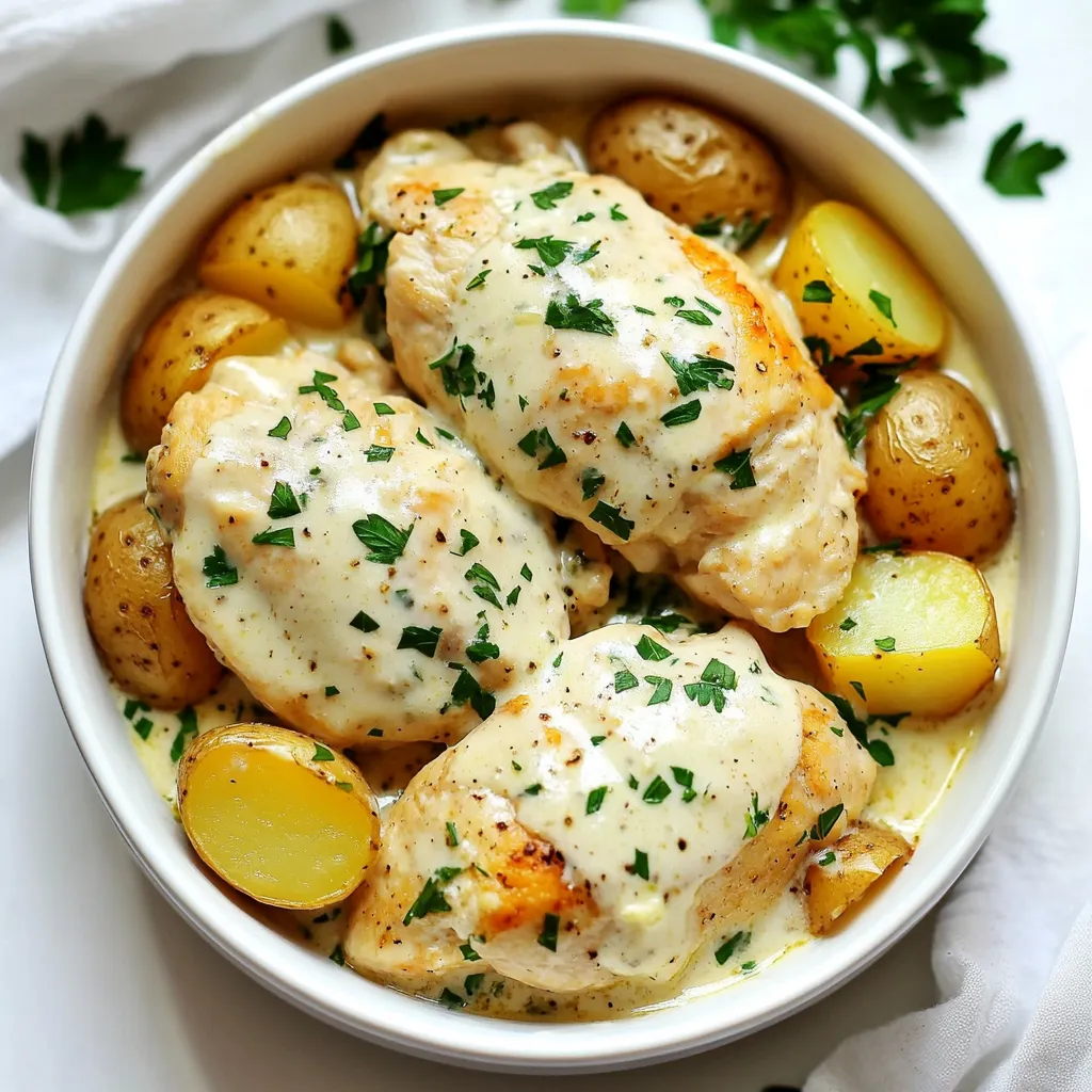 - Serve: Once done, carefully serve the chicken and potatoes on plates, spooning some of the creamy sauce over the top.