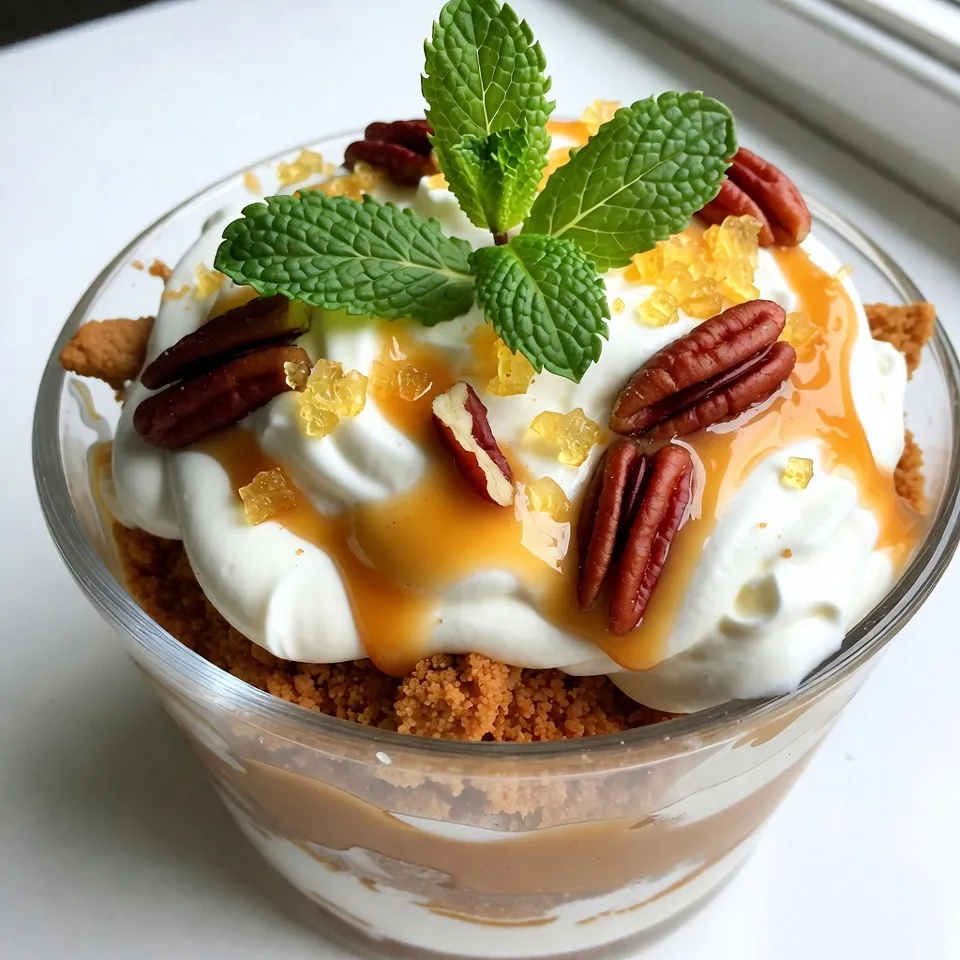 Grab a large trifle bowl or individual serving glasses. Start with a layer of crumbled gingerbread cookies at the bottom. Smooth it out to cover the bottom. Next, add a layer of your yogurt mixture. Use the back of a spoon to spread it evenly. Then, add a layer of whipped cream. Drizzle caramel sauce over the cream. Sprinkle chopped pecans or walnuts on top.