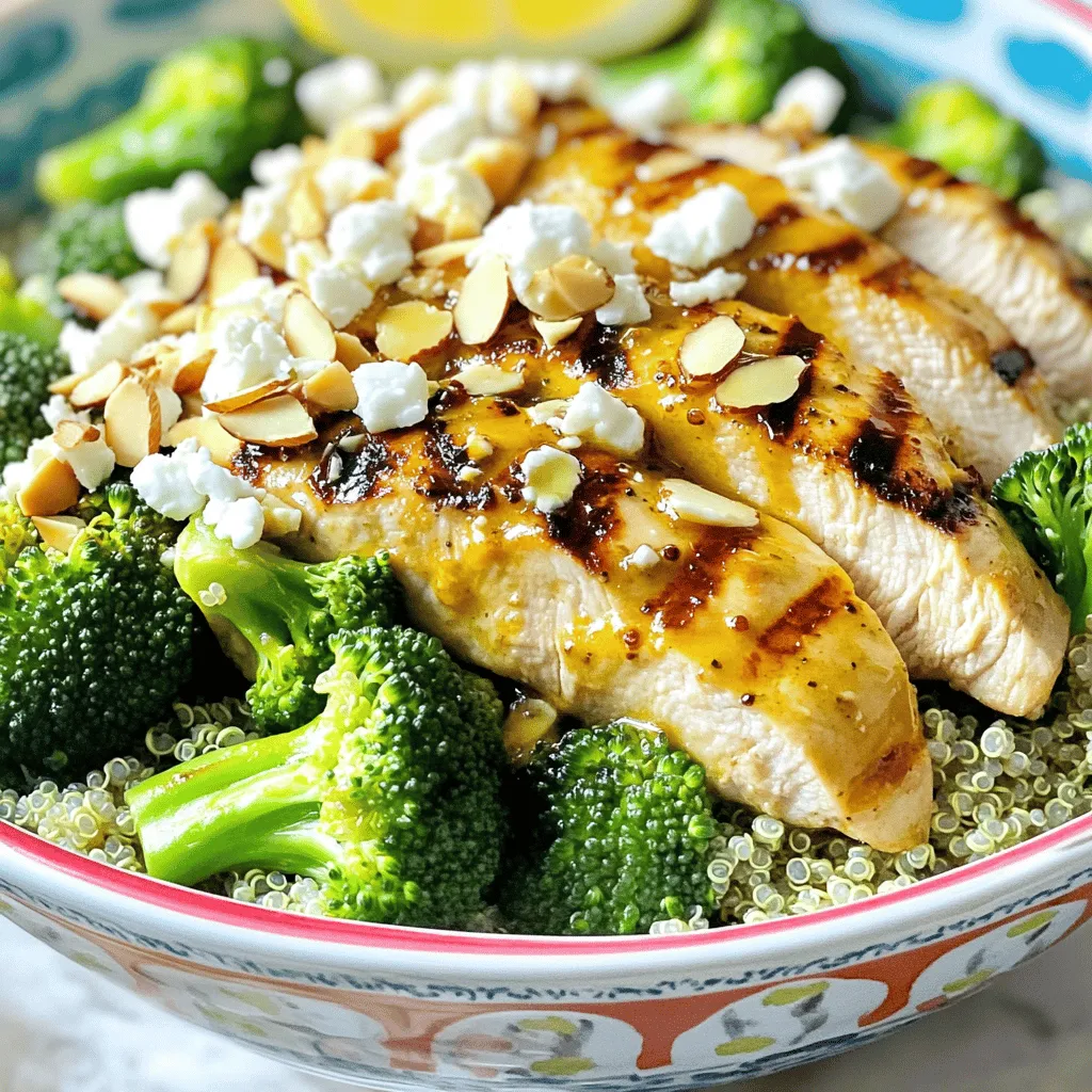 Start by cooking the chicken and broccoli. Let them cool, then slice the chicken. Store them in separate containers with quinoa. Keep the lemon juice and toppings separate until ready to eat. This way, your meal stays fresh all week.