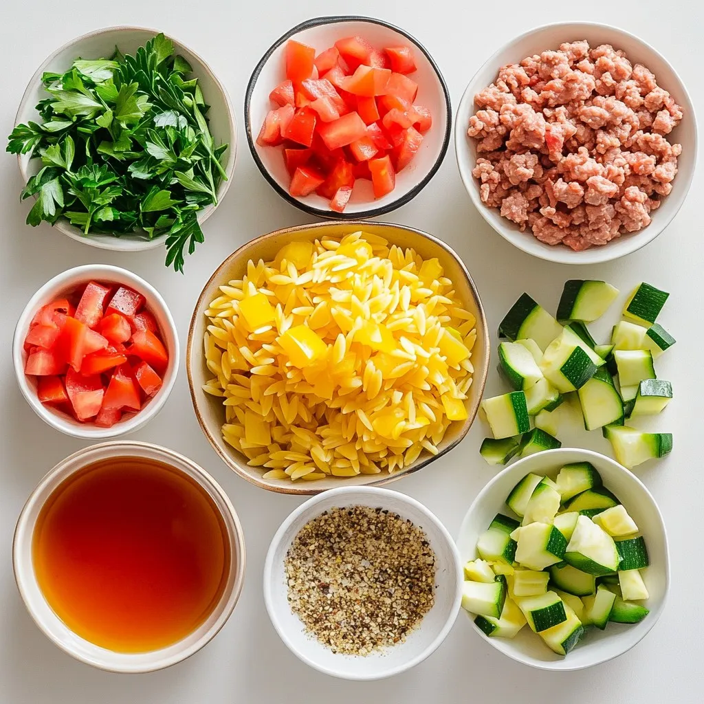 A hearty and flavorful one-pan dish featuring ground turkey, orzo pasta, and fresh vegetables.