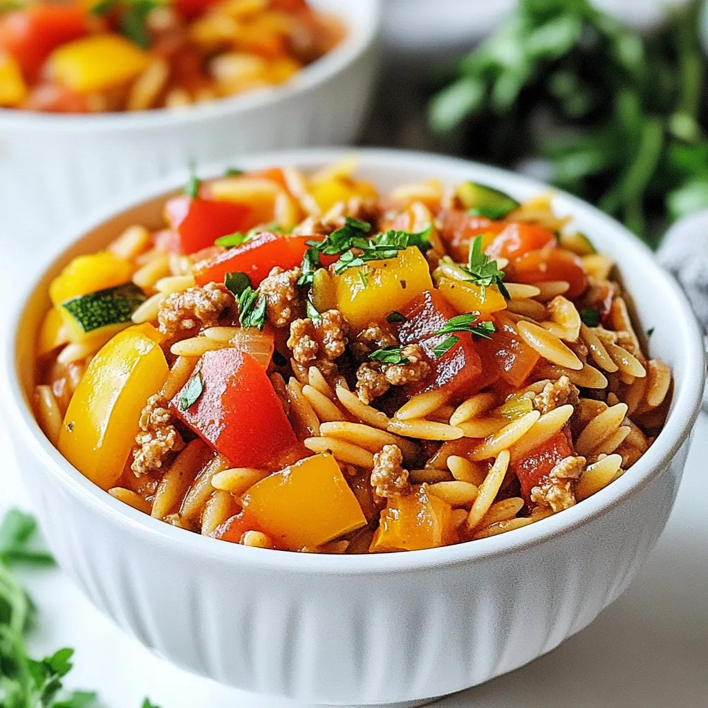 Ground turkey forms the heart of this dish. It is lean, tasty, and cooks quickly. I use one pound for a family of four. The turkey gives protein and keeps the meal light. Orzo pasta adds a nice texture. It looks like rice but tastes like pasta. One cup is all you need for this recipe. The orzo soaks up the flavors, making each bite delicious. For colors and taste, I add: - 1 medium onion, finely chopped - 2 cloves garlic, minced - 1 bell pepper (red or yellow), diced - 1 zucchini, diced These veggies add sweetness and crunch. The onion and garlic bring aroma that makes your kitchen smell great. Seasonings give depth to the dish. I use: - 1 teaspoon dried oregano - 1 teaspoon smoked paprika - 1/2 teaspoon salt (to taste) - 1/4 teaspoon black pepper (to taste) Fresh parsley adds a pop of color for garnish. It also brightens the flavors. Each of these ingredients works together to create a savory one-pan meal you’ll love! {{ingredient_image_1}} Start by heating two tablespoons of olive oil in a large skillet. Set your heat to medium. Once the oil is hot, add one finely chopped onion. Cook it until it turns translucent, which takes about three to four minutes. Next, stir in two minced garlic cloves. Cook for another minute until you smell the garlic. Now it’s time for the star of the dish: one pound of ground turkey. Add it to the skillet. Use a spatula to break it into smaller pieces. Cook the turkey until it is browned and no longer pink. This should take about five to seven minutes. Stir often to ensure even cooking. Next, we’ll add some color and crunch. Dice one bell pepper, either red or yellow, and one zucchini. Toss them into the skillet with the cooked turkey. Stir everything together and let it cook for about three to four minutes. You want the veggies to begin softening. Add one can of diced tomatoes, including the juices. Pour in two cups of chicken broth along with one teaspoon of dried oregano and one teaspoon of smoked paprika. Season with half a teaspoon of salt and a quarter teaspoon of black pepper. Mix well to combine all the flavors. Now, let’s bring in the orzo. Add one cup of orzo pasta to the boiling mixture. Stir it in, then reduce the heat to a simmer. Cover the skillet and let it cook for about ten to twelve minutes. Keep an eye on it and stir occasionally. This helps prevent the orzo from sticking. Once the orzo is al dente and most of the liquid is gone, remove the skillet from heat. Let it sit for a few minutes. This helps the flavors meld together. When ready to serve, use a fork to fluff the orzo. Garnish with fresh chopped parsley for a bright touch. Enjoy your delicious one-pan meal! To cook ground turkey well, use a large skillet. Heat olive oil first. This helps brown the turkey. Break it apart while cooking. Aim for a light brown color. This adds flavor. Stir often to cook evenly. When you add veggies, let them soften. This makes the dish tasty. Seasonings make your dish shine. Start with the basic amounts. You can always add more. If you like spice, try more black pepper. For a smoky flavor, boost the smoked paprika. Taste as you go. This helps you find the right balance. Fresh herbs can also add brightness. Try adding them at the end. This recipe is all about ease. You cook everything in one skillet. This saves time on cleanup. Start with the turkey, then add veggies. Finally, mix in orzo and broth. Everything cooks together. The orzo absorbs flavors from the dish. This makes for a hearty meal. Once it’s done, serve right from the pan. Beautiful and simple! Pro Tips Use Lean Turkey: Opt for lean ground turkey to keep the dish healthy while still being flavorful. Customize Your Veggies: Feel free to substitute or add vegetables like spinach, carrots, or mushrooms based on your preference. Cheese It Up: For an extra layer of flavor, consider adding a sprinkle of feta or Parmesan cheese just before serving. Store Leftovers Properly: Keep any leftovers in an airtight container in the fridge for up to three days for easy reheating. {{image_2}} You can easily change the taste of your Ground Turkey Orzo Skillet. Just add more veggies! Try carrots for a sweet crunch. Spinach adds color and nutrients. Broccoli is another great choice; it cooks quickly and tastes fresh. You can also use peas or corn for a pop of sweetness. Feel free to mix and match based on what you have at home. If you want to swap out the ground turkey, there are many options. Ground beef works well and gives a richer flavor. You can use ground chicken for a leaner choice. For a plant-based meal, try lentils or chickpeas; they add protein and fiber. These swaps keep your dish tasty and nutritious while catering to different diets. While orzo is delightful, you can use other pasta shapes too. Small shells or ditalini work nicely in this dish. If you prefer whole grain, choose whole wheat orzo for added health benefits. Gluten-free pasta is an option as well; just follow the cooking time on the package. Each type of pasta will bring its own unique texture to your meal. After enjoying your Ground Turkey Orzo Skillet, store any leftovers in an airtight container. This helps keep the dish fresh. Let the skillet cool down first before sealing it. You can store it in the fridge for up to three days. This meal tastes great even after a day or two. To reheat, simply place your leftovers in a skillet over medium heat. Stir occasionally, adding a splash of chicken broth if it seems dry. You can also use the microwave. Heat it in a bowl for about two minutes, stirring halfway through. Make sure it gets hot all the way through before eating. If you want to save some for later, freezing is a good option. Place the cooled dish in a freezer-safe container. Make sure to leave some space at the top, as it will expand when frozen. This meal can last up to three months in the freezer. When you’re ready to eat, thaw it in the fridge overnight and reheat it as mentioned above. Enjoy a warm and tasty meal