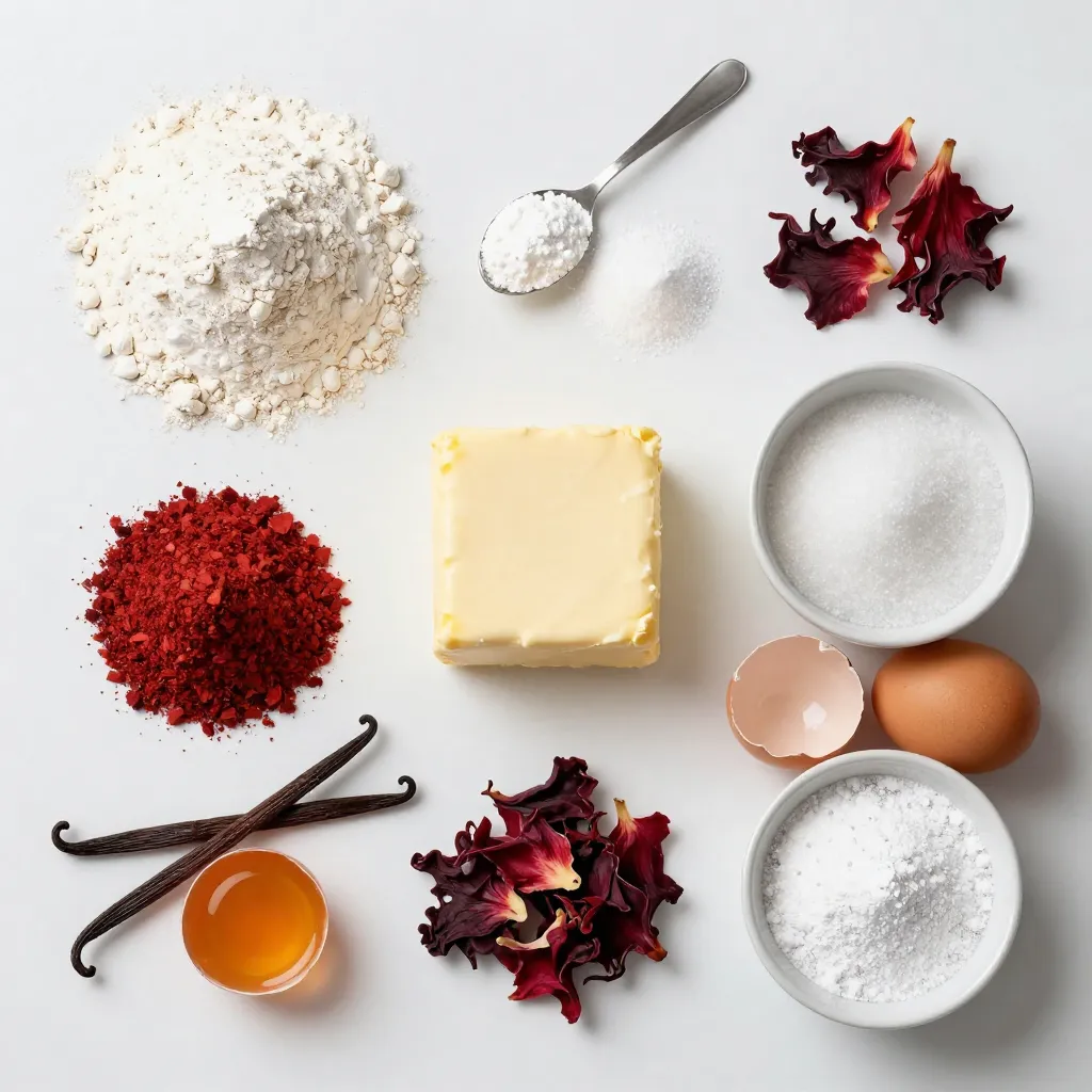The star of the show is dried hibiscus petals. Grind them finely to release their vibrant flavor. Finally, you will use powdered sugar for dusting at the end. This adds a nice touch to your cookies.