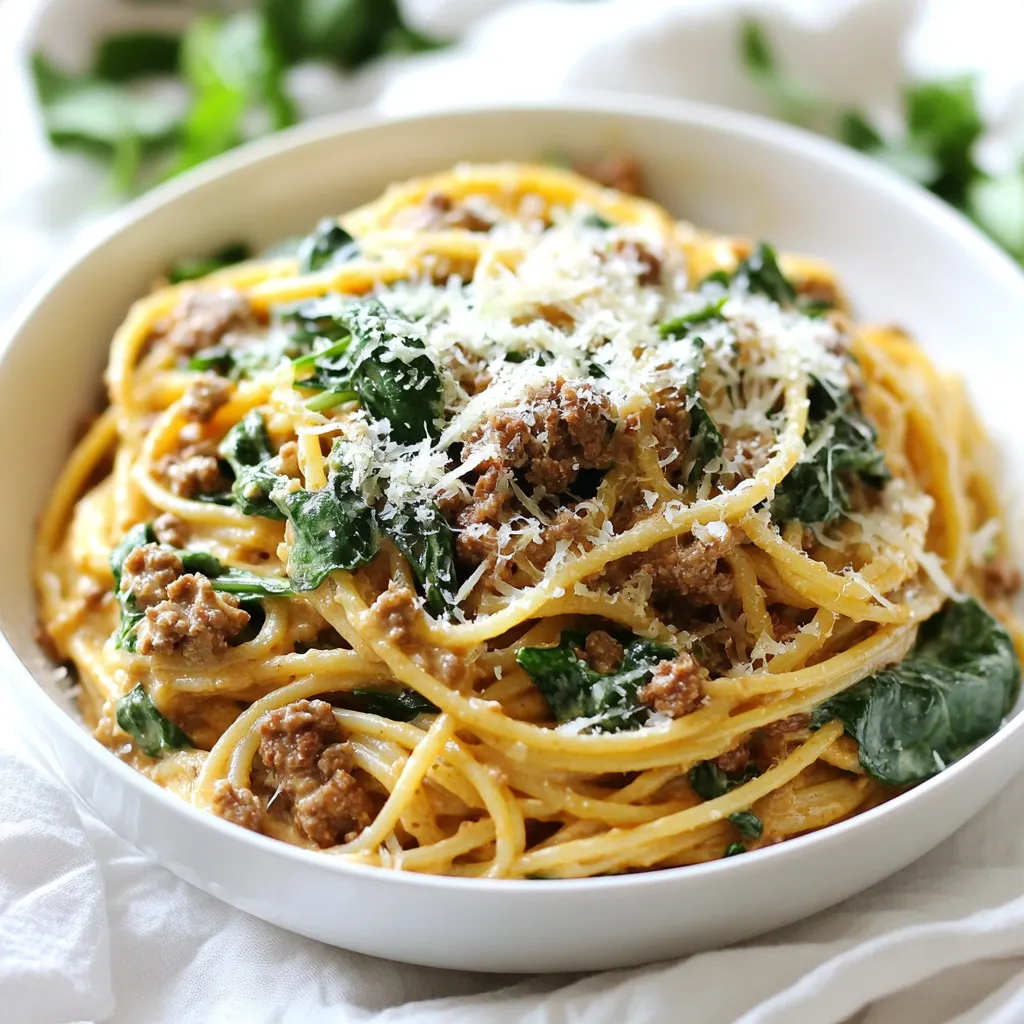 Next, add 1 cup of chopped spinach to the sauce. Stir until the spinach wilts, which takes about 2-3 minutes. Now, it’s time to mix in the drained pasta. Toss everything together until the pasta is well coated in the creamy beef sauce. Cook for an extra minute to warm it all up. If you like, sprinkle 1/4 cup of grated Parmesan cheese on top before serving.