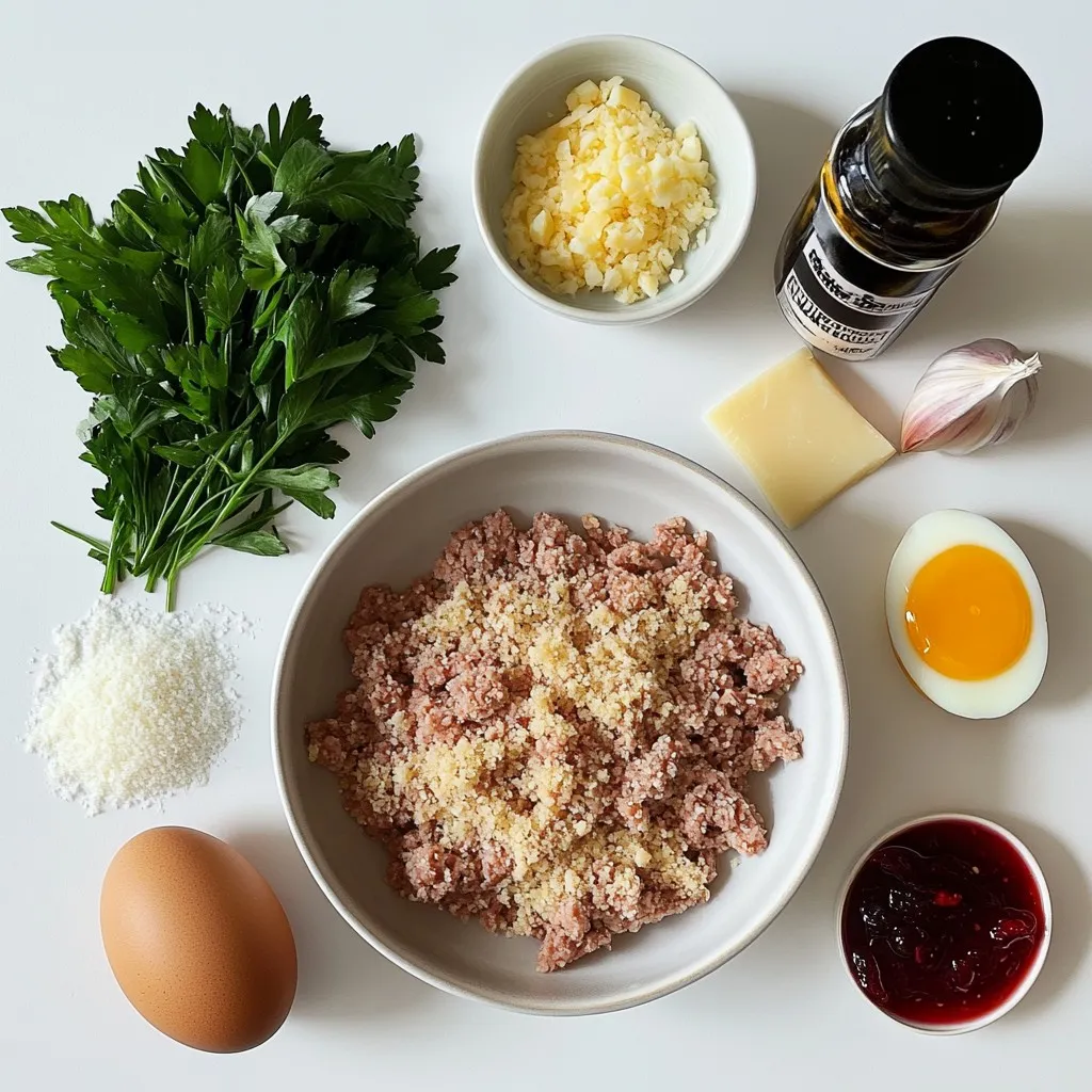 - In a large mixing bowl, combine the ground beef or turkey, breadcrumbs, Parmesan cheese, chopped parsley, beaten egg, minced garlic, onion powder, salt, and black pepper. Mix until well combined.