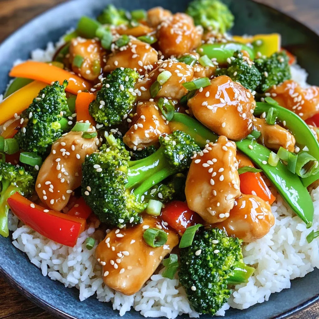 - 1 lb boneless, skinless chicken breasts, cut into bite-sized pieces - 1 cup broccoli florets - 1 bell pepper, sliced - 1 carrot, julienned - 1 cup snap peas, trimmed - 3 cloves garlic, minced - 1 inch ginger, grated - 1/4 cup honey - 1/4 cup soy sauce - 2 tablespoons rice vinegar - 1 tablespoon cornstarch mixed with 2 tablespoons water The chicken is the main attraction in this dish. I use boneless, skinless chicken breasts. They cook quickly and stay tender. You can cut them into bite-sized pieces for easy eating. The veggies add color and crunch. I love using broccoli, bell peppers, carrots, and snap peas. They give a nice mix of tastes and textures. The sauce brings everything together. Honey adds sweetness, while soy sauce gives that salty umami flavor. Rice vinegar gives a nice tang that brightens the dish. The cornstarch helps the sauce cling to the chicken and veggies. - 1 tablespoon sesame oil - Salt and pepper to taste - 2 tablespoons toasted sesame seeds - Green onions, chopped for garnish Sesame oil adds a rich, nutty flavor. I always use it to stir-fry the chicken. A pinch of salt and pepper enhances the taste without overpowering it. After cooking, I sprinkle toasted sesame seeds on top. They add a lovely crunch and extra flavor. Chopped green onions make a fresh, colorful garnish. They look great and taste even better. You can also add more at the end for a nice finish. This dish is all about balance. Each ingredient plays a key role in making it delicious. 1. Heating the skillet First, grab a large skillet or wok. Heat one tablespoon of sesame oil over medium-high heat. Make sure the oil is hot but not smoking. 2. Cooking the chicken Next, add one pound of boneless, skinless chicken pieces to the skillet. Season with salt and pepper to taste. Cook for about 5-7 minutes. Stir often until the chicken is browned and fully cooked. Once done, remove the chicken from the skillet and set it aside. 1. Adding garlic and ginger In the same skillet, add three minced garlic cloves and one inch of grated ginger. Cook these for about 30 seconds. This will make your kitchen smell amazing! 2. Incorporating the vegetables Now, toss in one cup of broccoli florets, one sliced bell pepper, one julienned carrot, and one cup of trimmed snap peas. Stir-fry the vegetables for 4-5 minutes. You want them to be bright and tender-crisp. 1. Mixing the sauce ingredients In a small bowl, combine 1/4 cup of honey, 1/4 cup of low-sodium soy sauce, 2 tablespoons of rice vinegar, and a cornstarch mixture made with 2 tablespoons of water. Stir well until everything blends smoothly. 2. Finishing the stir fry Return the cooked chicken to the skillet with the vegetables. Pour the sauce over the top. Stir-fry everything for another 2-3 minutes. This will thicken the sauce and coat all the ingredients nicely. Finally, sprinkle 2 tablespoons of toasted sesame seeds over the dish and toss gently to combine all the flavors. Stir-frying is fast. Keep your heat high to cook the chicken quickly. Use a large skillet or wok for even cooking. Always add the chicken in a single layer. This helps brown it well. Stir it often to avoid burning. To ensure your chicken is tender, cut it into small, bite-sized pieces. This way, it cooks evenly. Marinating the chicken for 15 minutes in soy sauce can also help. It adds flavor and keeps the meat juicy. Adjust the sauce's sweetness and saltiness to suit your taste. If you like it sweeter, add more honey. For more salt, increase the soy sauce. Taste the sauce before adding it to the stir-fry. This way, you can get it just right. Fresh ingredients make a big difference. I love using bright, crisp vegetables like broccoli, bell peppers, and snap peas. They add color and crunch. Try to use seasonal veggies for the best flavor and nutrition. This makes your dish shine! {{image_2}} You can change the protein in this dish easily. If you do not want chicken, try shrimp or tofu. Both options work well with the honey sauce. Shrimp cooks fast and adds a nice flavor. Tofu is a great choice for vegetarians. Use firm tofu for the best texture. Just cut it into cubes and add it during the veggie stir-fry step. You can swap out the veggies based on what you like or have. Try using zucchini or mushrooms instead of bell pepper. Cauliflower works great in place of broccoli. Seasonal veggies make this dish even better! In summer, add fresh corn. In fall, try adding butternut squash. Mixing different colors makes your dish pretty and tasty. The more variety, the more nutrients you get! You can store leftover Honey Sesame Chicken Stir Fry in the fridge. Place it in an airtight container. This keeps the meal fresh and tasty for up to three days. Make sure the stir fry cools down before sealing it. This helps prevent moisture build-up. If you want to save it for later, freezing is a great option. Use a freezer-safe container or a zip-top bag. Remove as much air as you can to avoid freezer burn. The stir fry can stay good for up to three months in the freezer. When you're ready to eat, thaw it overnight in the fridge. For quick reheating, you can use the microwave. Heat it in short bursts and stir in between to maintain even warmth. You can also reheat it on the stove over low heat. Just add a splash of water or broth to keep it moist. Enjoy your quick meal again! How can I make it spicier? To add some heat, use red pepper flakes or sriracha. Start with a little and taste as you go. You can also add sliced jalapeños for fresh spice. Mix it into the sauce for even flavor. Can I use pre-cooked chicken? Yes, you can! Using pre-cooked chicken saves time. Just add it to the pan after the veggies. Cook until heated through and coated with the sauce. Calories per serving This dish has about 350 calories per serving. It is a filling meal without being too heavy. Health benefits of ingredients - Chicken: A great source of protein, helps build and repair muscles. - Broccoli: Packed with vitamins and minerals, it's