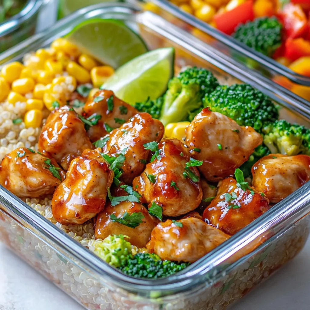 Now comes the fun partβputting it all together! In your meal prep containers, divide the cooked brown rice or quinoa evenly. On top of the rice, add the hot honey chicken and the sautΓ©ed vegetables. This layered look makes the meal more appealing and organized.