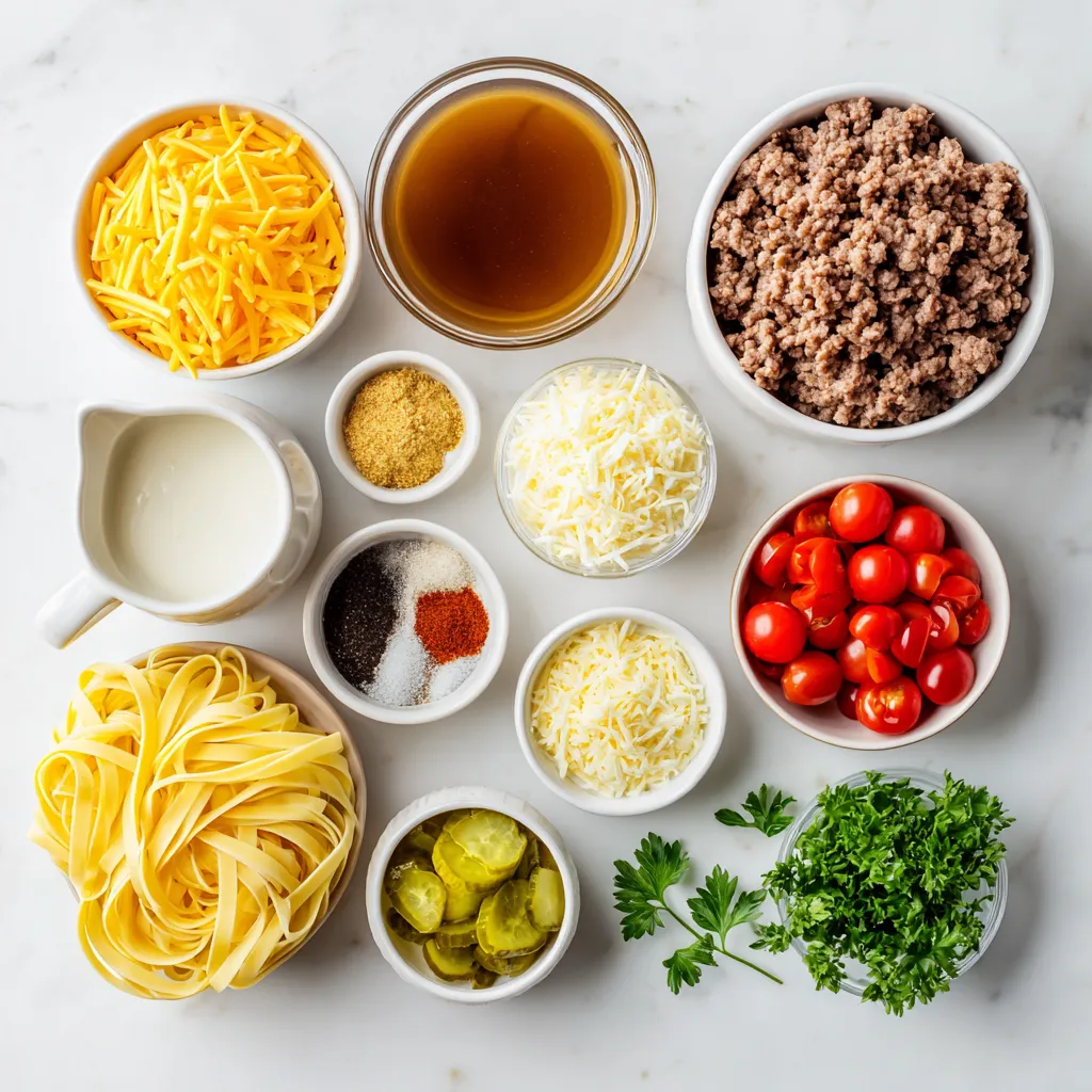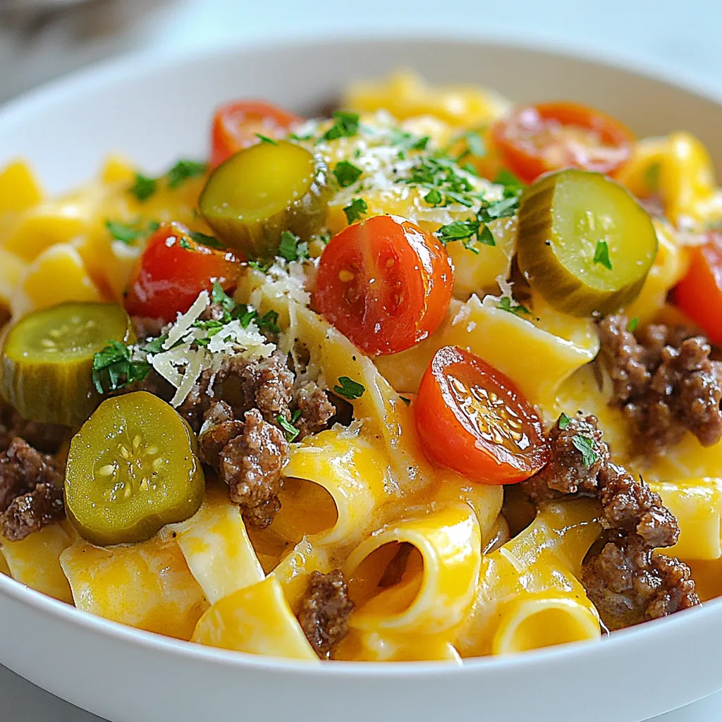 - 12 oz fettuccine pasta - 1 lb ground beef - 1 cup heavy cream Fettuccine pasta is the star here. It has a nice width to hold the sauce well. Ground beef gives the dish its hearty flavor and protein. Heavy cream makes the sauce rich and smooth. - 1 cup shredded cheddar cheese - ½ cup grated Parmesan cheese - 1 tablespoon garlic powder - 1 tablespoon onion powder - 1 teaspoon smoked paprika Cheddar cheese adds a sharp taste. Parmesan cheese gives a salty kick. Garlic powder and onion powder boost the flavor. Smoked paprika adds a hint of smokiness. - ½ cup diced pickles - ½ cup cherry tomatoes, halved - ¼ cup chopped fresh parsley (for garnish) Diced pickles give a nice crunch and tang. Cherry tomatoes add a burst of sweetness. Fresh parsley brightens the dish and adds color. These fresh ingredients elevate the whole meal. {{ingredient_image_1}} First, fill a large pot with water and add salt. Bring the water to a boil. Once boiling, add 12 oz of fettuccine pasta. Cook according to the package instructions until it is al dente. This usually takes about 8-10 minutes. After cooking, drain the pasta in a colander and set it aside. Next, take a large skillet and heat it over medium heat. Add 1 lb of ground beef. Use a spatula to break the meat into small pieces. Cook until it turns brown, which takes about 5-7 minutes. If there is a lot of grease, carefully drain the excess. This keeps your dish from being too oily. Now, let’s make the sauce. In the skillet with the browned beef, add 1 cup of heavy cream and 1 cup of beef broth. Stir everything well and bring it to a gentle simmer. This helps blend the flavors. Once it simmers, reduce the heat to low. Add 1 cup of shredded cheddar cheese, ½ cup of grated Parmesan cheese, 1 tablespoon of garlic powder, 1 tablespoon of onion powder, 1 teaspoon of smoked paprika, and salt and pepper to taste. Stir until the cheeses melt and the sauce thickens. Time to mix the pasta and sauce! Add the drained fettuccine to the skillet. Gently toss the pasta with the sauce. Make sure every piece of pasta gets a nice coating. This is key for flavor in every bite. Finally, you can add some fun toppings. Stir in ½ cup of diced pickles and ½ cup of halved cherry tomatoes. This adds freshness and crunch. Toss again to evenly distribute the toppings. For a pretty finish, serve it on plates and garnish with ¼ cup of chopped fresh parsley. Enjoy your loaded cheeseburger Alfredo pasta! To get the best texture for your pasta, cook it al dente. This means it should be tender but still firm to the bite. To achieve this, follow these steps: - Use plenty of water: A large pot helps the pasta move freely. - Salt the water: Add 1-2 tablespoons of salt. This flavors the pasta as it cooks. When the pasta is done, drain it well. Set it aside and let it cool slightly. This keeps it from sticking together. You can boost the flavor of your Loaded Cheeseburger Alfredo Pasta with simple seasonings. Here are some ideas: - Add more spices: Consider adding chili powder or cayenne pepper for heat. - Substituting ingredients: If you want a healthier option, swap ground beef for turkey or chicken. You can also use a plant-based meat for a vegetarian dish. Try different cheeses too! Mozzarella or Gouda can add a unique twist. Pair your pasta with sides for a complete meal. Here are some ideas: - Salads: A fresh garden salad works well, adding crunch and color. - Bread: Garlic bread or a soft baguette complements the creamy sauce nicely. These sides balance the rich flavors of the pasta and provide a satisfying meal. Pro Tips Cook Pasta Al Dente: Cooking your fettuccine until just al dente ensures it holds its shape and texture when mixed with the creamy sauce. Brown the Beef Well: Make sure to brown the ground beef thoroughly for added flavor. This step enhances the overall taste of the dish. Cheese Variety: Experiment with different cheese combinations, like mozzarella or gouda, for a unique flavor twist in your alfredo sauce. Garnish for Freshness: Always finish with fresh herbs, like parsley, to add a pop of color and a bright flavor contrast to the rich sauce. {{image_2}} You can change the meat in this dish to fit your taste. Try using ground turkey or chicken for a lighter option. Both will still give you that great flavor. If you want a vegetarian option, swap the meat for cooked lentils or a meat substitute. These choices keep the meal hearty and filling. Cheese is key in this recipe, but you can get creative! Mixing different cheeses can add unique flavors. Try using mozzarella for a stretchy texture or gouda for a smoky twist. If you prefer non-dairy, look for vegan cheese that melts well. Nutritional yeast is also a great way to add a cheesy taste without dairy. Don’t be afraid to add more color and health to your dish! Bell peppers or spinach can bring extra nutrition and flavor. Just sauté them for a few minutes before mixing them in. For fun garnishes, try crispy bacon bits or extra pickles. These additions make your Loaded Cheeseburger Alfredo Pasta even more exciting! To keep your loaded cheeseburger Alfredo pasta fresh, store it in a sealed container. This helps prevent air from getting in and keeps the dish tasty. You can add a layer of plastic wrap over the top for extra protection. For the best results, refrigerate it within two hours of cooking. This keeps the flavors locked in and stops bacteria from growing. You can store the pasta in the fridge for up to three days. When it’s time to enjoy your leftovers, you have a few good options. The best way to reheat the pasta is on the stove. Just add a splash of beef broth or cream to the skillet to help it warm up. Stir it gently over medium heat until it’s hot. You can also use the microwave. Just place the pasta in a microwave-safe bowl and cover it with a damp paper towel. Heat it in 30-second bursts, stirring in between. This helps keep the creaminess and prevents it from drying out. Always check if it’s 