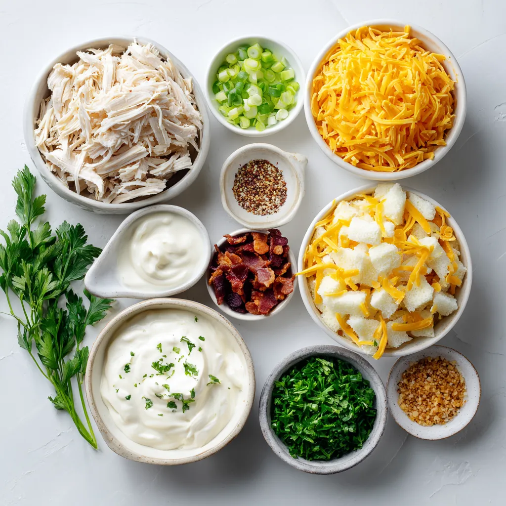 The main ingredients in this dish create a creamy and hearty base. The cooked, shredded chicken adds protein and flavor. The frozen hash browns provide a great texture. Ranch dressing gives a zesty taste, while cheddar cheese adds richness. Sour cream offers a smooth finish, balancing everything out.