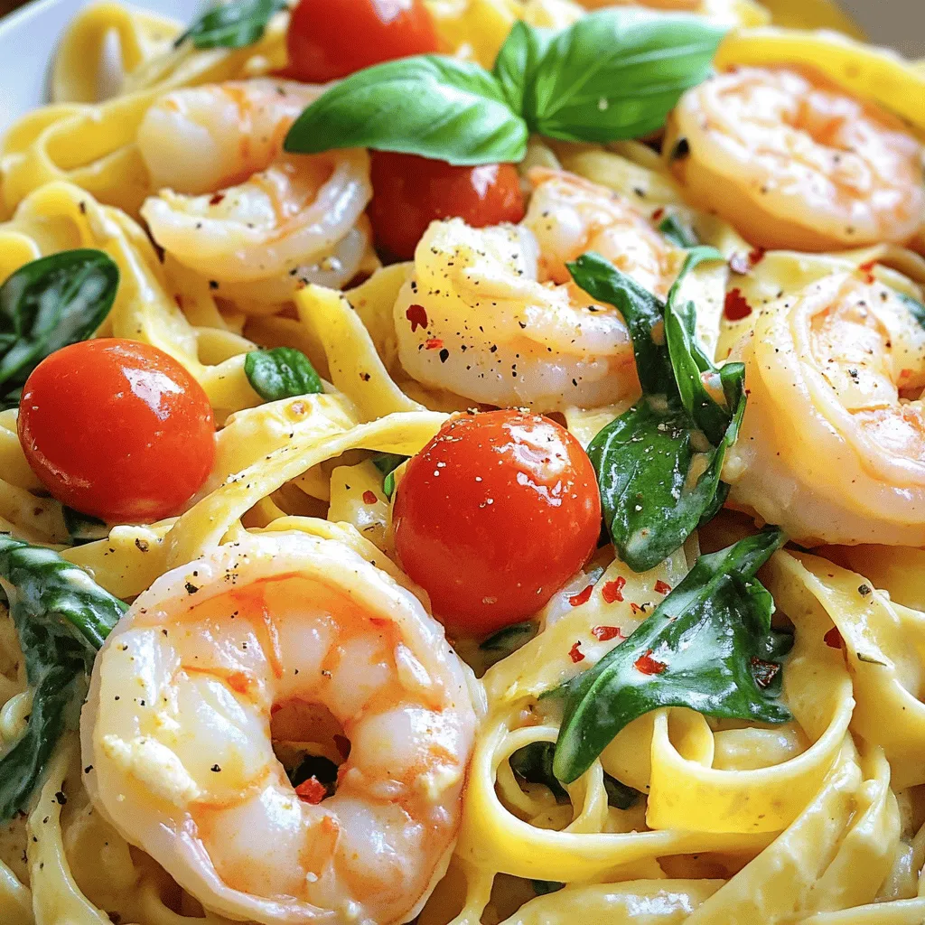 Each ingredient plays a key role in creating this creamy dish. The fettuccine provides a hearty base. The shrimp adds protein and flavor. Garlic gives a nice aroma, while red pepper flakes add a bit of heat. Cherry tomatoes brighten the dish, and heavy cream makes it rich. Parmesan cheese adds depth, while spinach brings freshness.