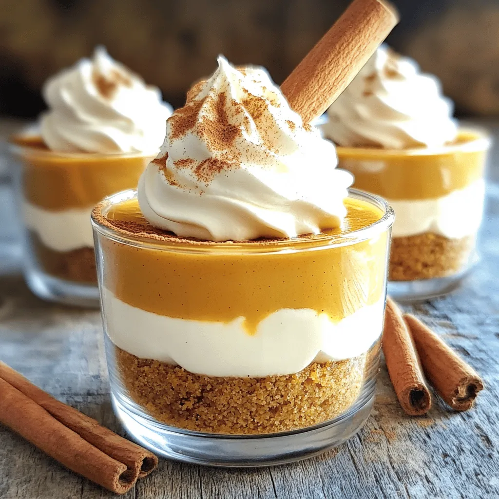 Once your filling is ready, it’s time to assemble the cups. In a separate bowl, whip 1 cup of heavy cream until it forms stiff peaks. Gently fold this whipped cream into the pumpkin mixture. This step makes your filling light and airy. Spoon the pumpkin cheesecake filling over the crust in each cup. Fill them about three-quarters full. Now, place the cups in the fridge for at least 3 hours to set. When they are ready, you can top them with whipped cream and a sprinkle of cinnamon. Enjoy this simple and delightful treat!