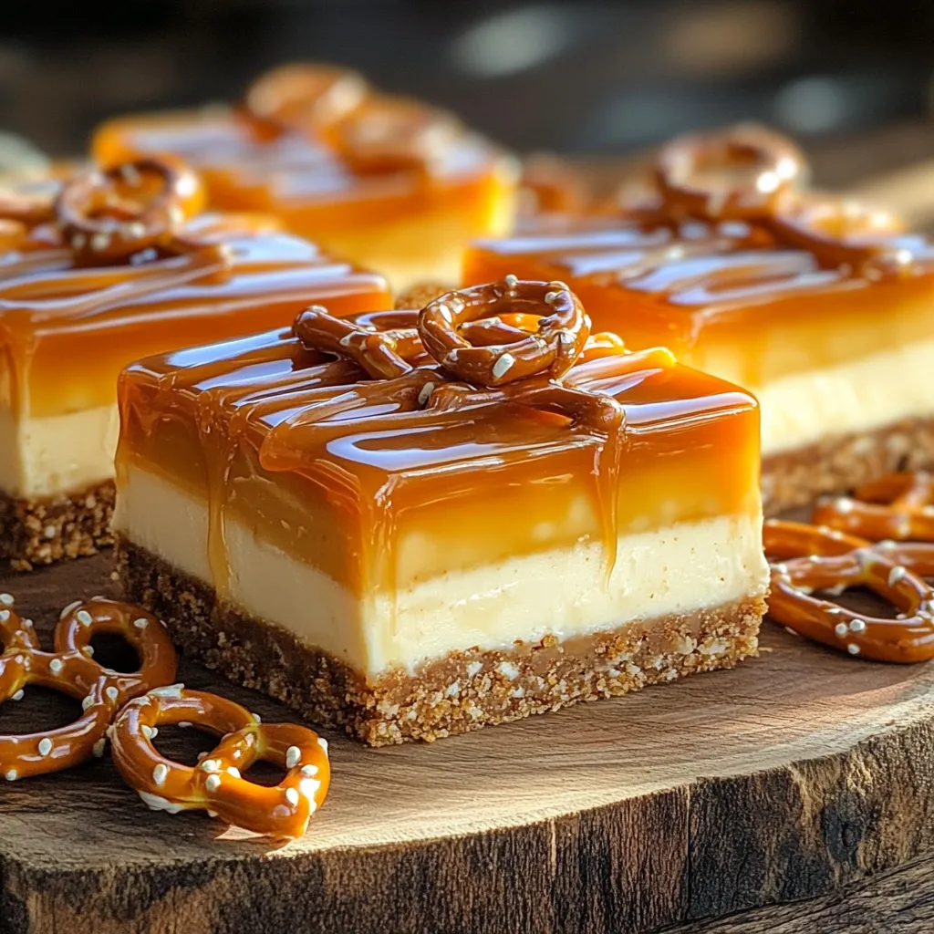 For cutting your cheesecake bars, a sharp knife works best. Dip it in warm water to make clean cuts. This helps avoid messy edges. As for serving, I suggest letting the bars sit out for a few minutes. This makes them easier to eat. Serve them cool, but not too cold, to enjoy all the flavors. Garnish with extra pretzels and a drizzle of caramel for a lovely look.