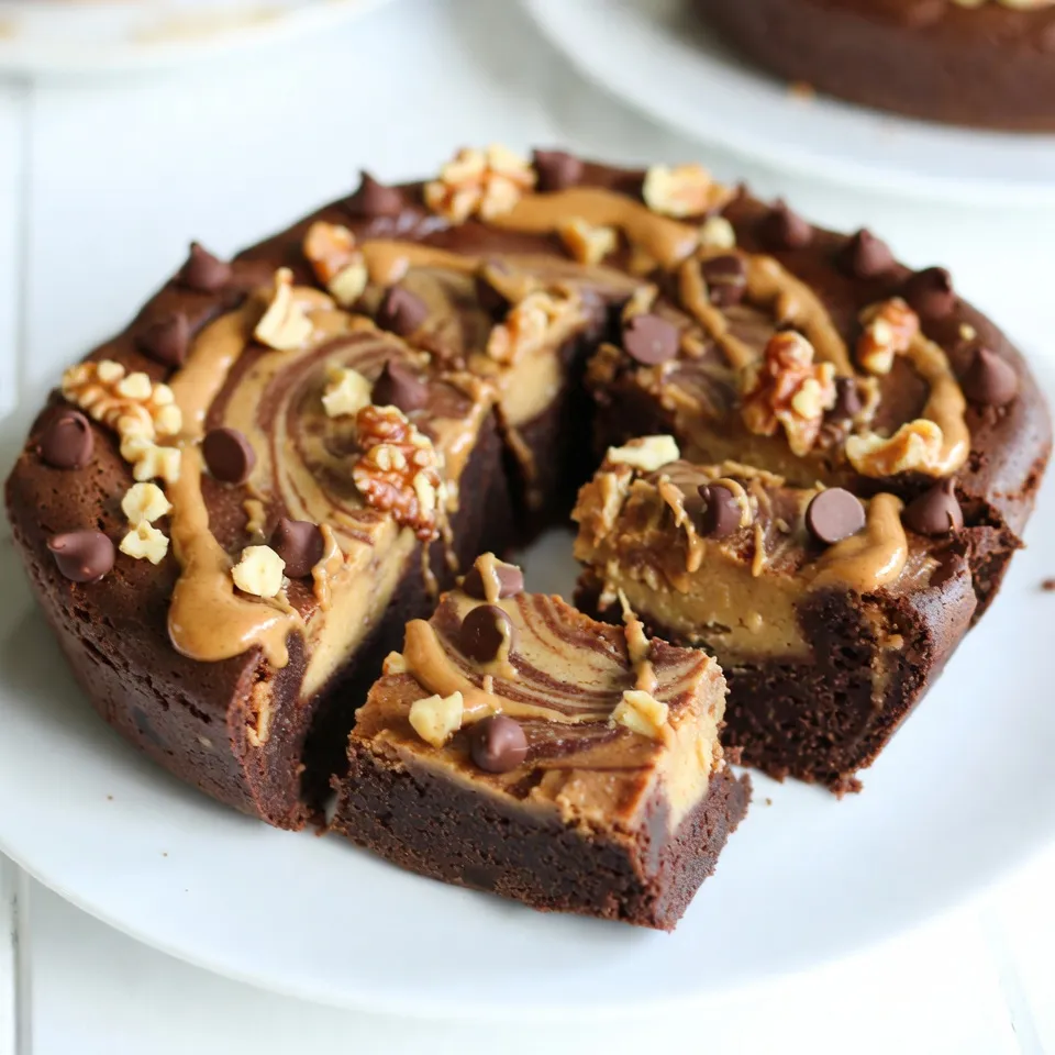 Now itβs time to bake! Add chocolate chips and walnuts on top of the batter and peanut butter mixture. Use a knife or skewer to gently swirl the batter. Create a marbled effect, but avoid overmixing. Place the dish in the oven and bake for 30-35 minutes. To check if itβs done, insert a toothpick in the center. If it comes out clean, your cake is ready! Let it cool in the pan on a wire rack before serving.