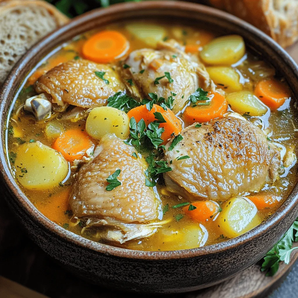 ![- 2 lbs boneless, skinless chicken thighs, cut into chunks - 4 medium carrots, sliced - 3 medium potatoes, diced - 1 onion, chopped - 3 cloves garlic, minced - 4 cups low-sodium chicken broth - 1 cup frozen peas - 2 teaspoons dried thyme - 1 teaspoon dried rosemary - Salt and pepper to taste - 2 tablespoons olive oil - 1 tablespoon cornstarch (optional, for thickening) - Fresh parsley, chopped (for garnish) To make this stew, you will need two pounds of chicken thighs. They give the dish a rich flavor. Use four medium carrots; they add sweetness and color. For the base, three medium potatoes work well. Chop one onion and mince three cloves of garlic for depth. Use four cups of low-sodium chicken broth for moistness. Add one cup of frozen peas at the end for a pop of green. Season with two teaspoons of dried thyme and one teaspoon of dried rosemary. Don’t forget salt and pepper to taste. For a touch of smoothness, use two tablespoons of olive oil. If you like a thicker stew, one tablespoon of cornstarch will do the trick. Feel free to get creative with this stew! You can add celery for crunch or bell peppers for sweetness. Swap chicken for turkey or beef if you want a different protein. Fresh herbs like basil or oregano can also bring new flavors. If you want a spicier kick, toss in some red pepper flakes. You can even add a splash of white wine for a touch of acidity. Adapt the recipe to make it your own! Start by gathering all your ingredients. This makes cooking smooth and easy. Chop the onion, garlic, carrots, and potatoes. Cut the chicken thighs into bite-sized pieces. Season the chicken with salt, pepper, thyme, and rosemary. This step adds flavor right from the start. Heat olive oil in a skillet over medium-high heat. Add the chopped onion and garlic. Sauté them for 3-4 minutes until the onion is soft. Next, add the seasoned chicken to the skillet. Brown the chicken for about 5-7 minutes. This gives the chicken great color and taste. After browning, move the chicken to the slow cooker. In the slow cooker, add the carrots, potatoes, and chicken broth. Stir everything well to mix. Cover the slow cooker and set it on low for 6-7 hours or high for 3-4 hours. The chicken and veggies should become tender. If you want a thicker stew, mix cornstarch with cold water. Stir this into the stew during the last 30 minutes of cooking. About 15 minutes before serving, add the frozen peas. This adds a nice pop of color and sweetness. Taste the stew and adjust the seasoning if needed. If it needs more salt or pepper, feel free to add. Serve hot in bowls and garnish with fresh parsley. It makes the dish look inviting and fresh. Enjoy your savory slow cooker chicken stew! For the full recipe, check the section above. To boost the taste of your chicken stew, use fresh herbs. They add a bright flavor. You can also try adding a splash of lemon juice. This brings out the chicken's taste. Another tip is to brown the chicken first. This step adds a rich, deep flavor. Don’t forget to taste the broth! Adjust the seasoning as needed to make it just right. Slow cooking works best with larger cuts of meat. This helps them stay tender. Make sure to layer ingredients properly. Put the meat at the bottom and veggies on top. This way, the meat absorbs all the flavors. Keep the lid on while cooking. Every time you lift the lid, heat escapes and cooking slows down. One common mistake is adding too much liquid. The stew will become too watery. Stick to the recipe’s broth amount for best results. Another mistake is not chopping veggies evenly. Uneven pieces cook at different rates. Lastly, avoid cooking on high heat for too long. This can dry out the chicken. Follow the [Full Recipe] for best results. {{image_2}} You can switch up the protein in this stew. Instead of chicken, try: - Beef chunks for a heartier dish. - Pork shoulder for a tender, rich flavor. - Turkey for a lighter option. Each change gives a new taste. Adjust the cooking time if you choose beef or pork. They might need longer to become tender. You can make this stew meat-free easily. Use these tips: - Replace chicken with chickpeas or lentils. - Use vegetable broth instead of chicken broth. - Add more veggies, like zucchini or bell peppers. These swaps keep the stew filling and delicious. You will still enjoy the warmth and comfort. Using seasonal ingredients makes your stew fresh. Here are some ideas: - In spring, add fresh asparagus and peas. - In summer, use tomatoes and green beans. - In fall, try butternut squash and kale. These swaps bring new flavors. You can explore different tastes with each season. For the full recipe, check out the Cozy Autumn Chicken Stew. After you enjoy your savory slow cooker chicken stew, store any leftovers properly. First, let the stew cool to room temperature. Next, transfer it to an airtight container. Make sure to seal it well to keep out air. Store the container in the fridge. This stew will stay fresh for up to four days. When you want to enjoy your leftover stew, reheating is easy. You can use a microwave or stove. If using the microwave, place the stew in a bowl. Heat it in short bursts, stirring in between. This helps heat evenly. On the stove, pour the stew into a pot. Heat it over medium heat, stirring often. Make sure it’s hot all the way through before serving. If you want to keep your stew longer, freezing is a good option. Use freezer-safe containers or bags. Pour the cooled stew into the container, leaving some space at the top. This allows for expansion as it freezes. Seal tightly and label with the date. Your stew can last in the freezer for up to three months. When you're ready to eat, thaw it in the fridge overnight before reheating. This will keep it safe and tasty. For the full recipe, check out the Cozy Autumn Chicken Stew . Slow Cooker Chicken Stew lasts about 3 to 4 days in the fridge. Store it in an airtight container. If you want it to last longer, freeze it. In the freezer, it can l