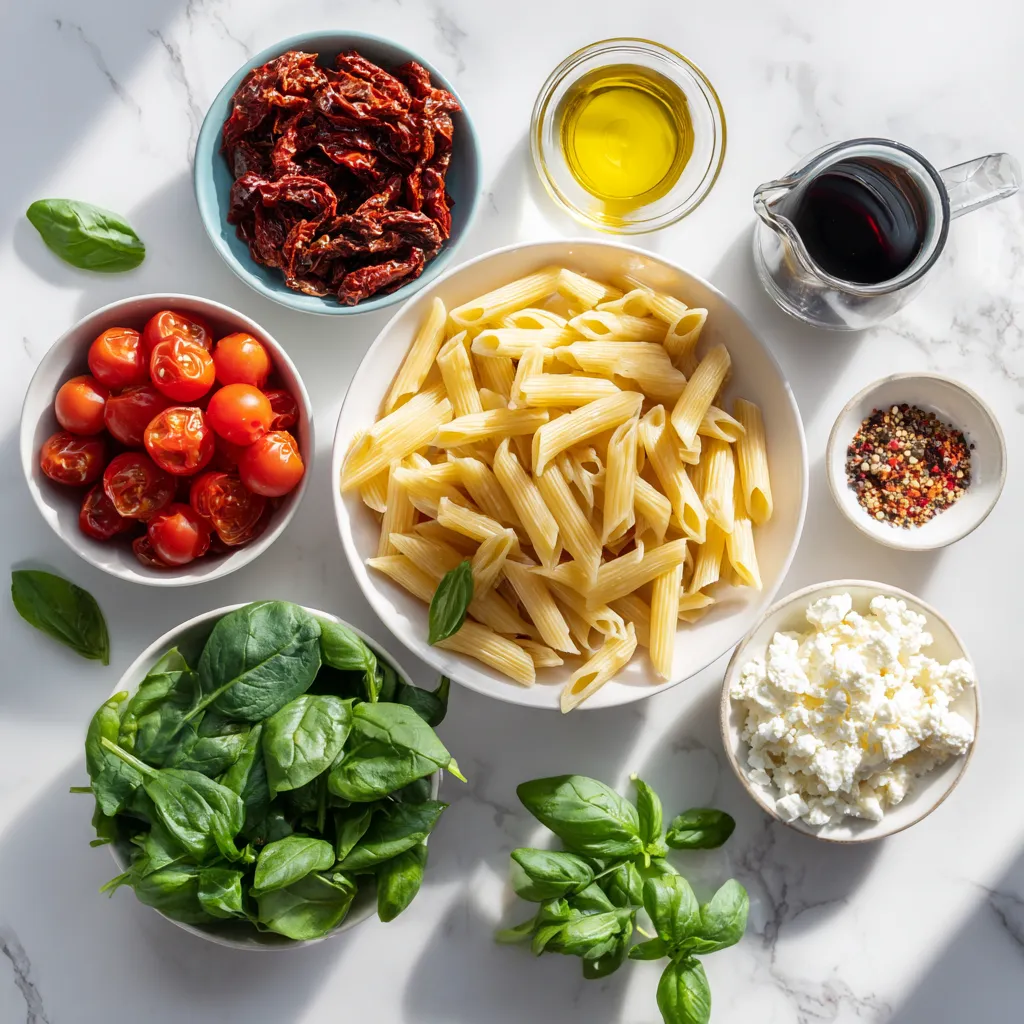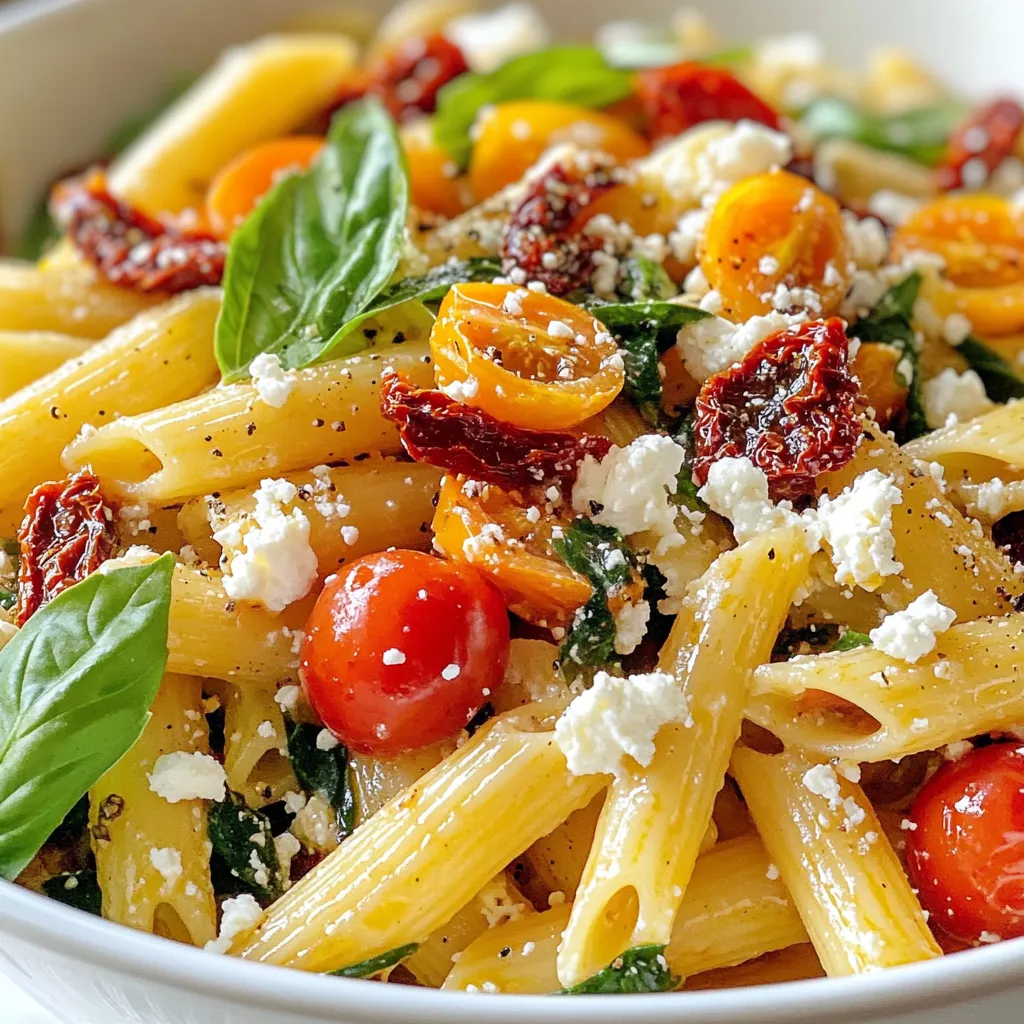 Serve your sun-dried tomato pasta in shallow bowls. Garnish with fresh basil leaves and an extra sprinkle of feta. A drizzle of olive oil adds a nice touch too. Enjoy this quick and easy meal!