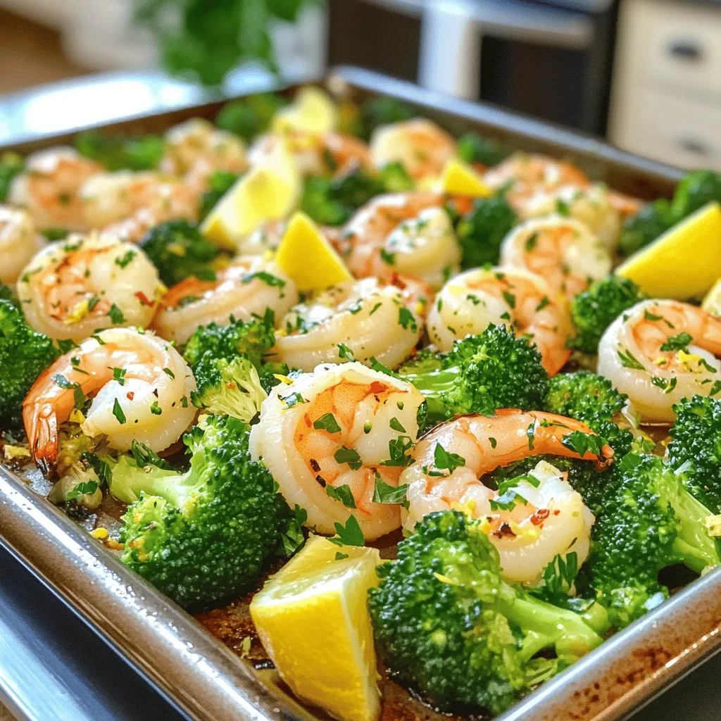- 1 pound large shrimp, peeled and deveined - 4 cups broccoli florets - 4 tablespoons olive oil - 4 cloves garlic, minced - Zest and juice from 1 large lemon - 1 teaspoon red pepper flakes (optional) - Salt and pepper to taste - Fresh parsley, chopped for garnish You need fresh shrimp for the best taste. I recommend using large shrimp. They hold flavor well and cook quickly. Peel and devein them before cooking. Next, you'll want broccoli florets. Choose bright green, crisp pieces. They add a nice crunch and color. Olive oil is key for a rich flavor. It helps the shrimp and broccoli roast nicely. Now for the seasonings. Garlic adds depth to the dish. Fresh minced garlic gives the best flavor. Zest and juice from a lemon brightens everything up. It adds a fresh and tangy taste. If you like a little heat, add red pepper flakes. It’s optional, but it can enhance the dish. Finally, don’t forget salt and pepper. They balance the flavors. Garnish with fresh parsley for a pop of color and freshness. It makes the dish look inviting. With these ingredients, you're set for a tasty meal that is easy to make. Enjoy the burst of flavors in every bite! - Preheat your oven to 400°F (200°C). - In a large bowl, combine the shrimp, broccoli, olive oil, and minced garlic. Start by preheating the oven. This step helps cook the shrimp and broccoli evenly. While the oven warms up, grab a big bowl. Toss in your shrimp and broccoli. Add the olive oil and minced garlic. Mix gently. This gives everything a nice coat of flavor. - Add lemon zest, juice, and seasonings. - Spread mixture on sheet pan and roast. Next, zest the lemon and squeeze in its juice. This adds a bright flavor. Add salt and pepper to taste. If you want some heat, sprinkle in the red pepper flakes. Mix everything well. Now, spread the shrimp and broccoli on a parchment-lined sheet pan. Make sure they are in a single layer for even cooking. Roast in the oven for 12-15 minutes. The shrimp should turn pink and opaque, while the broccoli stays crisp. - Check doneness and garnish before serving. Once the cooking time is up, check if everything is done. The shrimp should look bright pink, and the broccoli should be tender. Take the pan out of the oven, and let it cool for a minute. Garnish with chopped parsley for a pop of color. Serve it right from the pan or on a platter. Enjoy your dish! Adjusting the seasoning is key to great taste. Start with salt and pepper. Use fresh garlic for the best flavor. Fresh lemon juice and zest brighten the dish too. If you want, add more red pepper flakes for heat. To ensure even cooking, spread shrimp and broccoli in a single layer. This helps them roast nicely. Bake at 400°F for 12-15 minutes. The shrimp should turn pink and opaque when done. The broccoli should be tender yet crisp. Pair this dish with rice or quinoa for a full meal. A light salad also works well. For presentation, serve from the pan or on a platter. Add lemon wedges and parsley for color and flair. {{image_2}} You can switch up the vegetables in this dish. Instead of broccoli, try: - Green beans - Asparagus - Bell peppers - Zucchini These veggies add their own unique flavors and textures. For proteins, shrimp is great, but you can also use: - Chicken breast, cut into pieces - Firm tofu, cubed - Scallops Each protein offers a different taste and feel to the meal. To change the flavor, consider adding herbs or spices. Try: - Fresh thyme - Oregano - Basil These herbs give a fresh twist. You can also use spices like: - Paprika - Cumin For citrus, lemon is classic, but you can substitute with: - Lime juice - Orange zest - Grapefruit juice These variations can brighten up the dish in new ways. If you need gluten-free options, use gluten-free soy sauce or tamari. For dairy-free diets, this recipe is naturally dairy-free, so you're all set! To lower sodium, reduce or skip the salt. You can also use low-sodium soy sauce for extra flavor without the salt. Adjust these options to fit your needs! To keep your shrimp and broccoli fresh, store them in an airtight container. This helps prevent spoilage. Place the leftovers in the fridge within two hours of cooking. They can last up to three days this way. If you want to save them for later, freezing is a great option. To freeze, put the dish in a freezer-safe container. Make sure to label it with the date. Use the leftovers within three months for the best taste. When it's time to eat your leftovers, reheating properly matters. I recommend using the oven for the best results. Preheat it to 350°F (175°C). Spread the shrimp and broccoli on a baking sheet. Heat them for about 10 minutes or until hot. You can also use a skillet on medium heat. Stir gently until warmed through, which takes about five minutes. Avoid the microwave if possible, as it can make the shrimp tough. Yes, you can prepare the shrimp and broccoli mix a few hours ahead. Just keep it in the fridge. When ready, spread it on the sheet pan and roast it. This saves time and keeps the flavors fresh. Lemon garlic shrimp pairs well with many sides. Consider serving it with: - Steamed rice - Quinoa - Garlic bread - A simple green salad These options balance the dish and add variety. Shrimp are done when they turn pink and opaque. They should curl slightly but not be tight. Check them around the 12-minute mark. If they meet these signs, they are ready to serve. Absolutely! This meal stores well in the fridge for up to three days. You can reheat it in the oven or microwave. It makes for a quick lunch or dinner option, keeping your week stress-free. Yes, you can use frozen shrimp. Just make sure to thaw them first. Place them in cold water for about 15-20 minutes. Once thawed, you can follow the recipe as usual. This recipe for lemon garlic shrimp delivers vibrant flavors and easy prep steps. You learned how to choose fresh ingredients, season perfectly, and roast shrimp and broccoli to perfection. Remember to explore variations and adapt it to your 