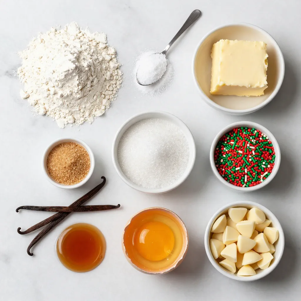 The egg binds everything together and adds moisture. The vanilla and almond extracts bring warmth and a lovely aroma to the cookies. Festive sprinkles make these treats eye-catching. White chocolate chips add a creamy sweetness that balances the flavors perfectly.