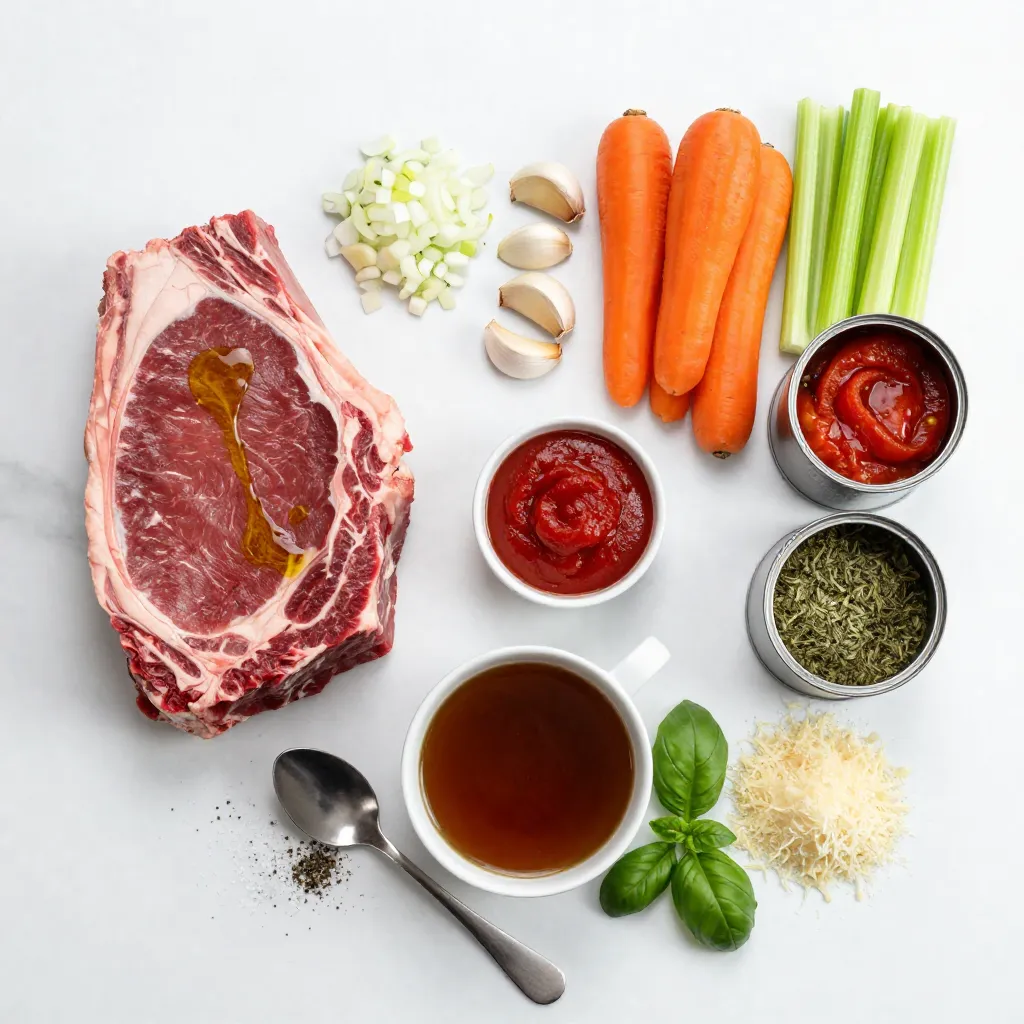 The main ingredients create a rich and hearty dish. The beef chuck roast gives it a nice flavor. Searing the beef in olive oil adds depth. Chopping onion, garlic, carrot, and celery makes the base of the sauce. Crushed tomatoes and tomato paste bring the sauce together. Beef broth adds moisture and flavor. Oregano and basil give it that Italian touch. Salt and pepper help balance the taste. Fresh basil and Parmesan cheese are great for serving.