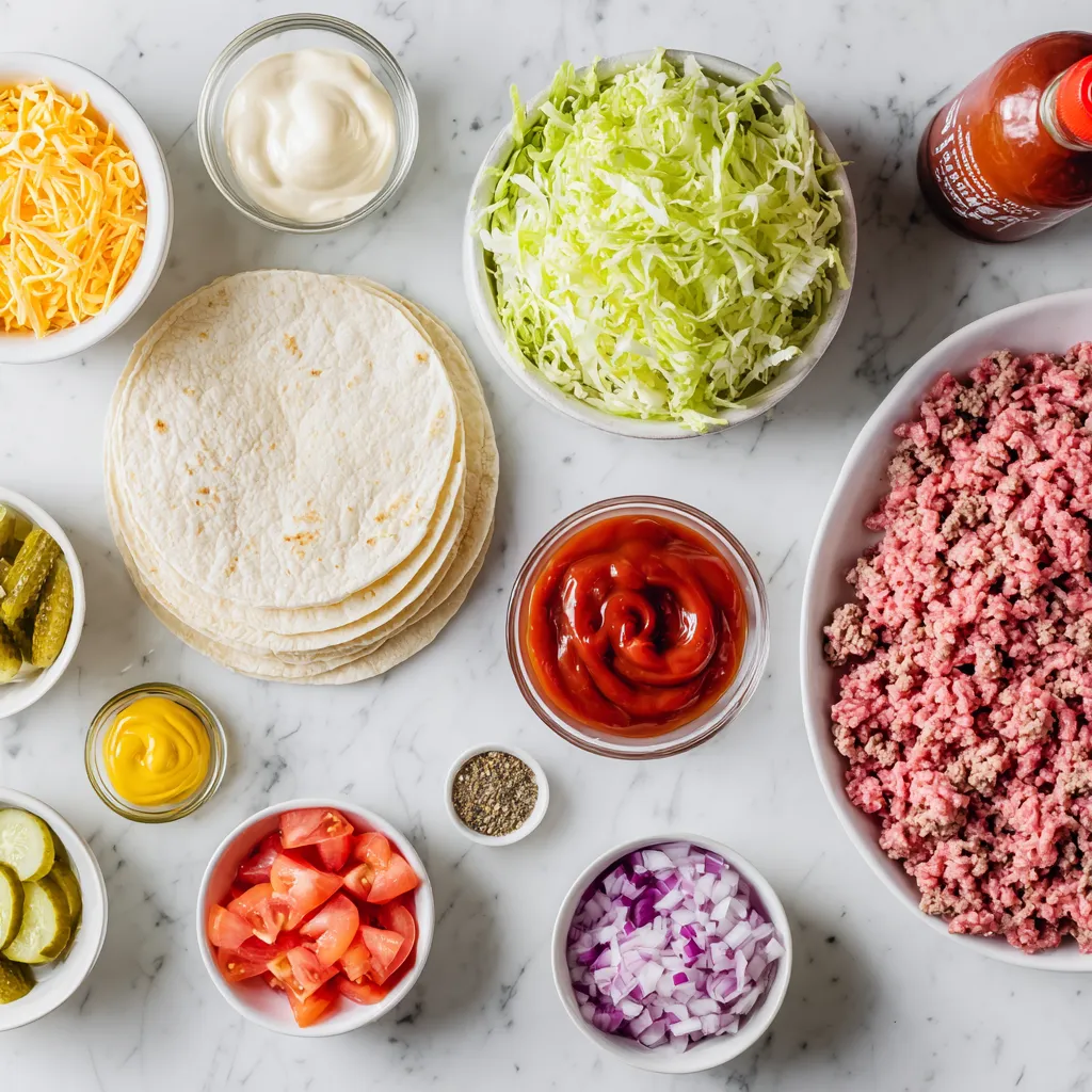 - In each warm tortilla, place a smashed burger patty. Top with shredded lettuce, diced tomatoes, chopped onions, sliced pickles, and a drizzle of mayo, ketchup, and mustard.