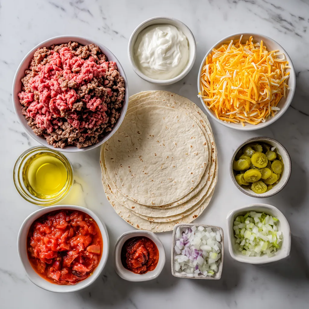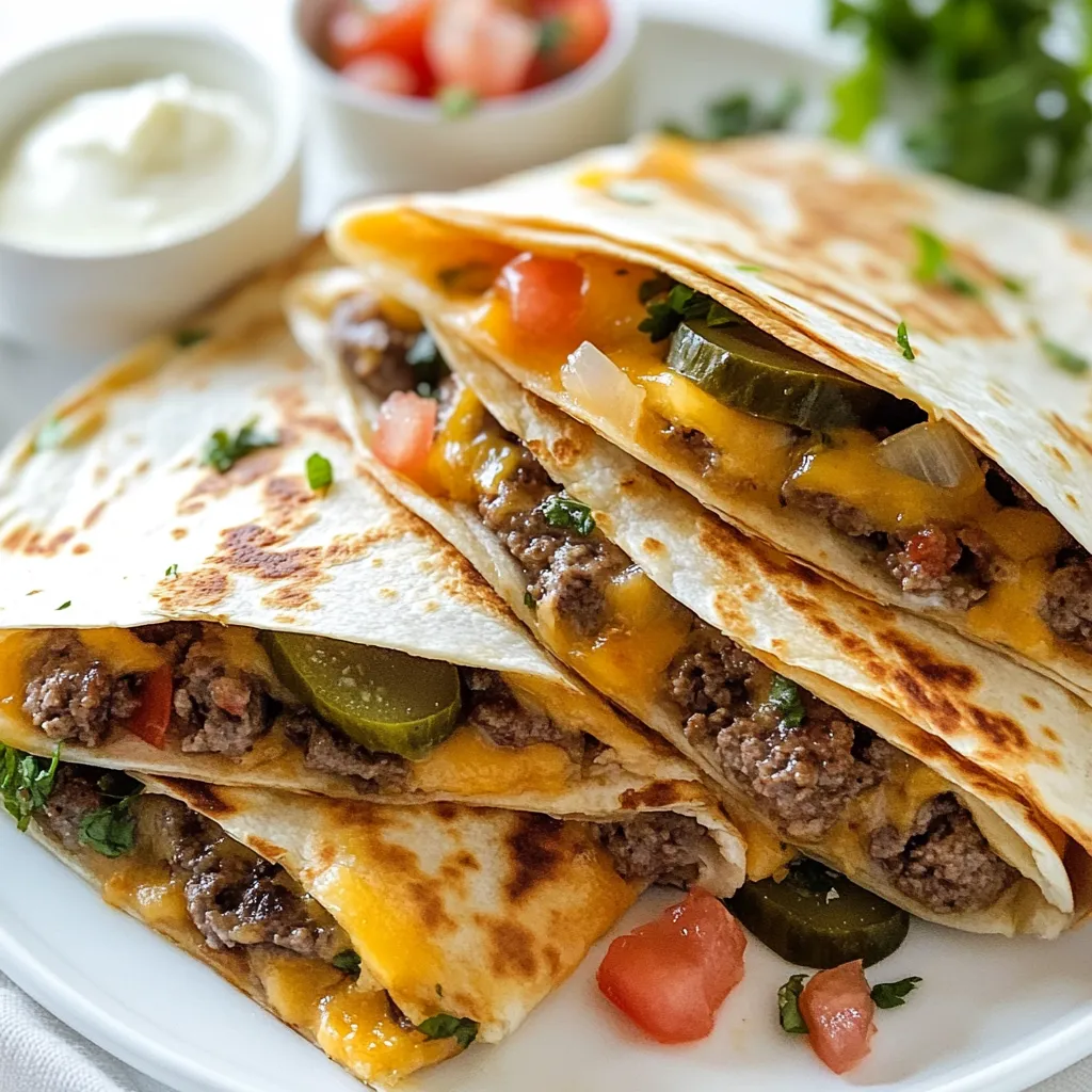 The main ingredients for Smashburger quesadillas create a flavorful meal. Ground beef serves as the star, bringing rich taste. Flour tortillas wrap everything, making them easy to hold. The mix of cheddar and Monterey Jack cheeses adds creaminess. Onions and tomatoes give freshness, while pickles add a nice crunch.