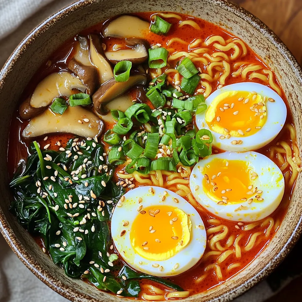 How you serve your ramen matters. Use deep bowls to hold the broth. Start by placing the noodles in the center. Then, artfully arrange the mushrooms and spinach around them. Halve the soft-boiled eggs and place them on top, cut side up. Finish with a sprinkle of green onions and sesame seeds. This not only looks great but also makes each bite special.