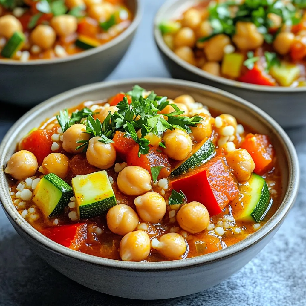 Couscous acts as a fluffy base for this stew. It cooks quickly and absorbs flavors well. Chickpeas add protein and a nice texture. Fresh vegetables like onion, garlic, bell pepper, and zucchini bring color and nutrients to the dish.