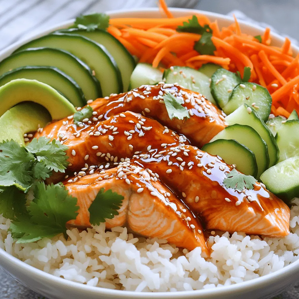 When serving, arrange the toppings nicely. Place cucumber, avocado, and carrot around the salmon for color. Don’t forget to sprinkle with green onions and sesame seeds. These add crunch and flavor. Drizzling extra marinade over the top gives it a nice finish. Pair these bowls with a light salad or steamed veggies for a full meal. Enjoy your beautiful and tasty creation!